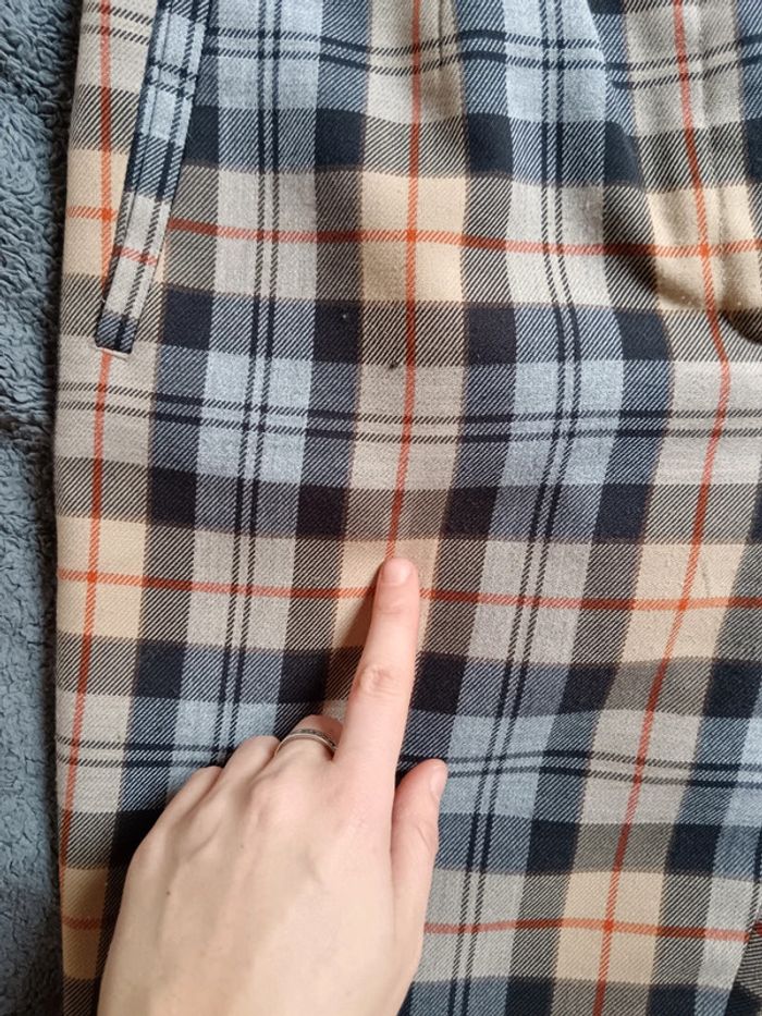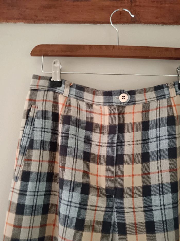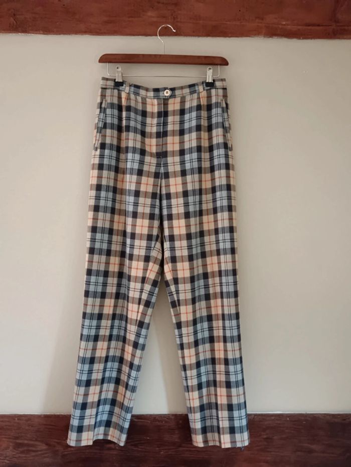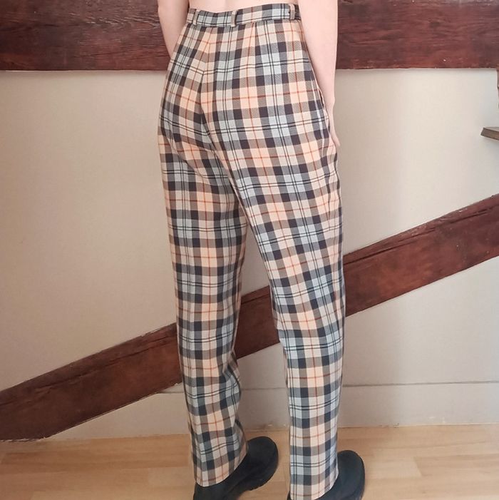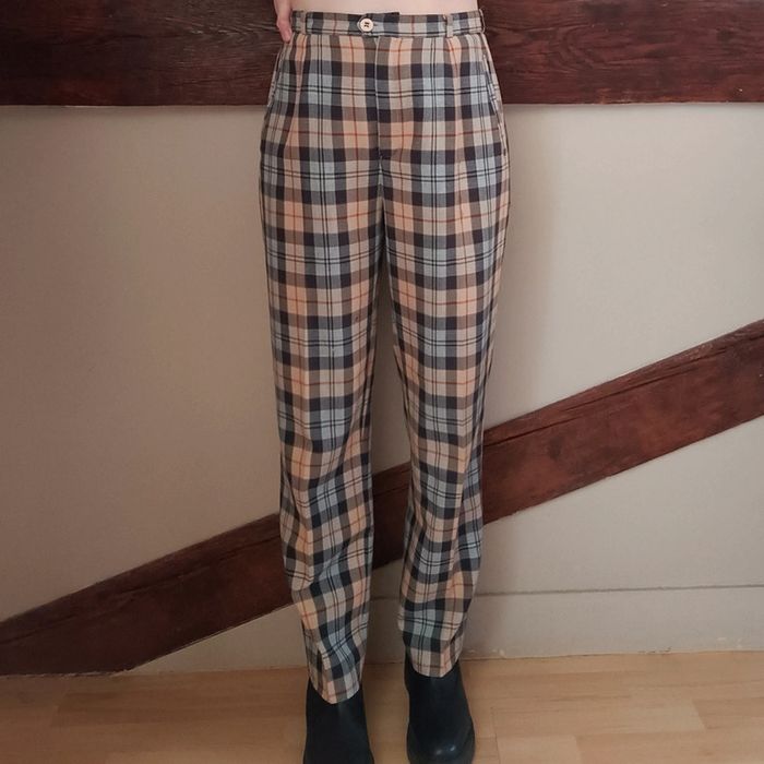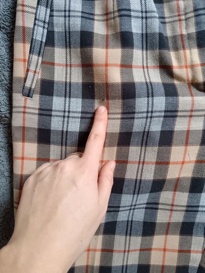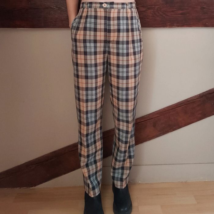 Pas d'envoi Vinted go, merci - ✨ Pantalon taille haute à pinces coupe droite motif tartan carreaux beige, rouge et bleu marine Absence d'étiquette Au toucher c'est un beau tissu type viscose coton polyester mélangés À noter un minuscule reprisage à gauche de la poche droite ainsi qu'une petite zone décolorée juste en dessous, voir les dernières photos Taille grand 36 Je le porte sur un 36 sur les photos et mesure 1m61 📏 Dimensions à plat : largeur taille 35cm, fourche 29cm, hanches 48cm, longueur 96cm ⚠️ Étant une entreprise déclarée payant des charges, merci de respecter mon travail en ne le bradant pas 🙏 #desibellesfripes36