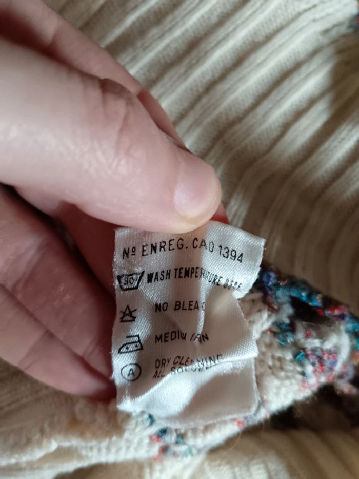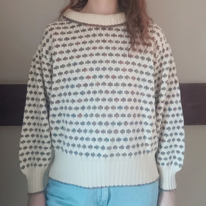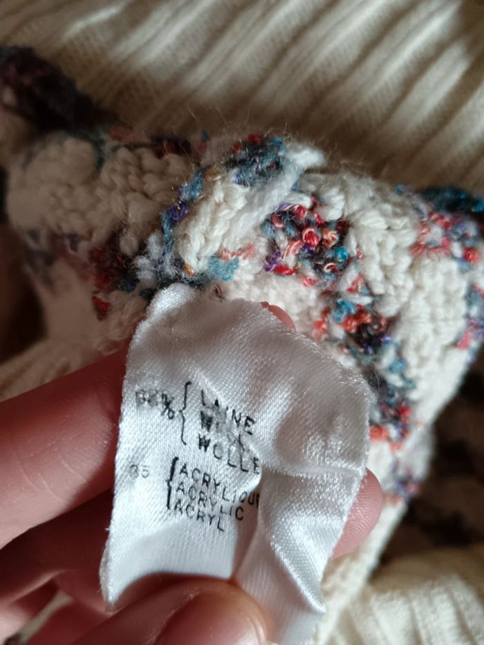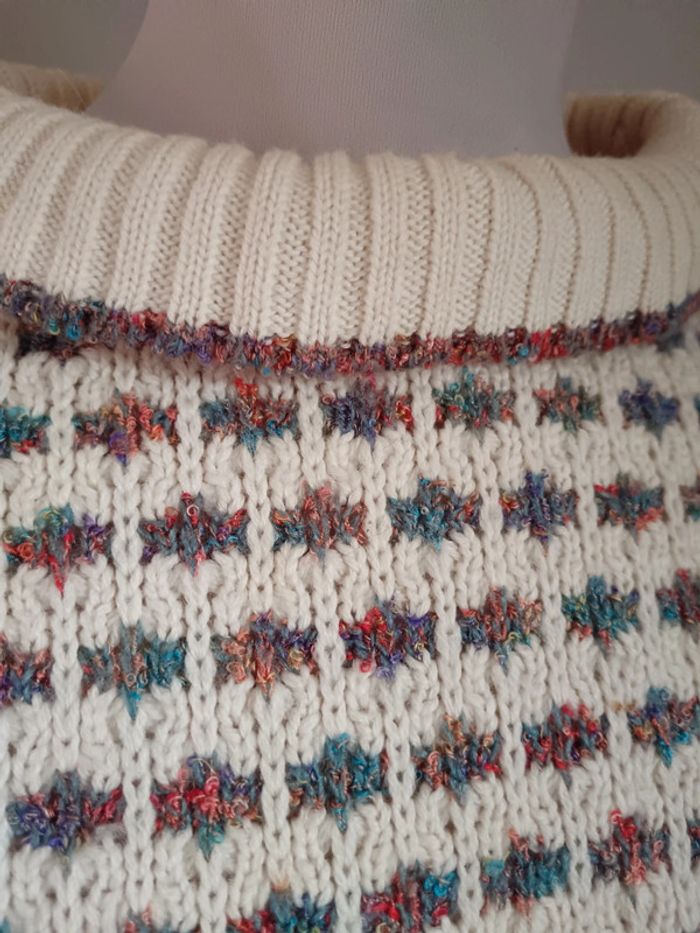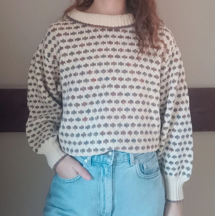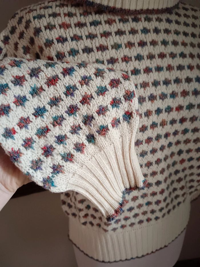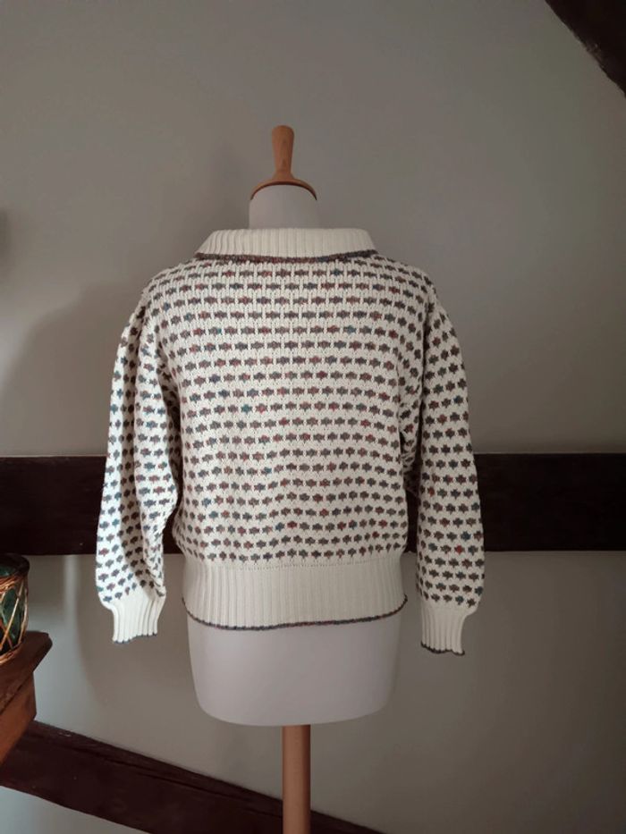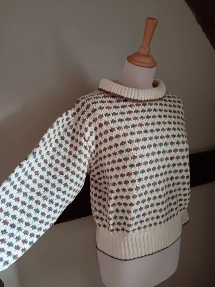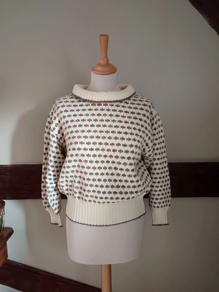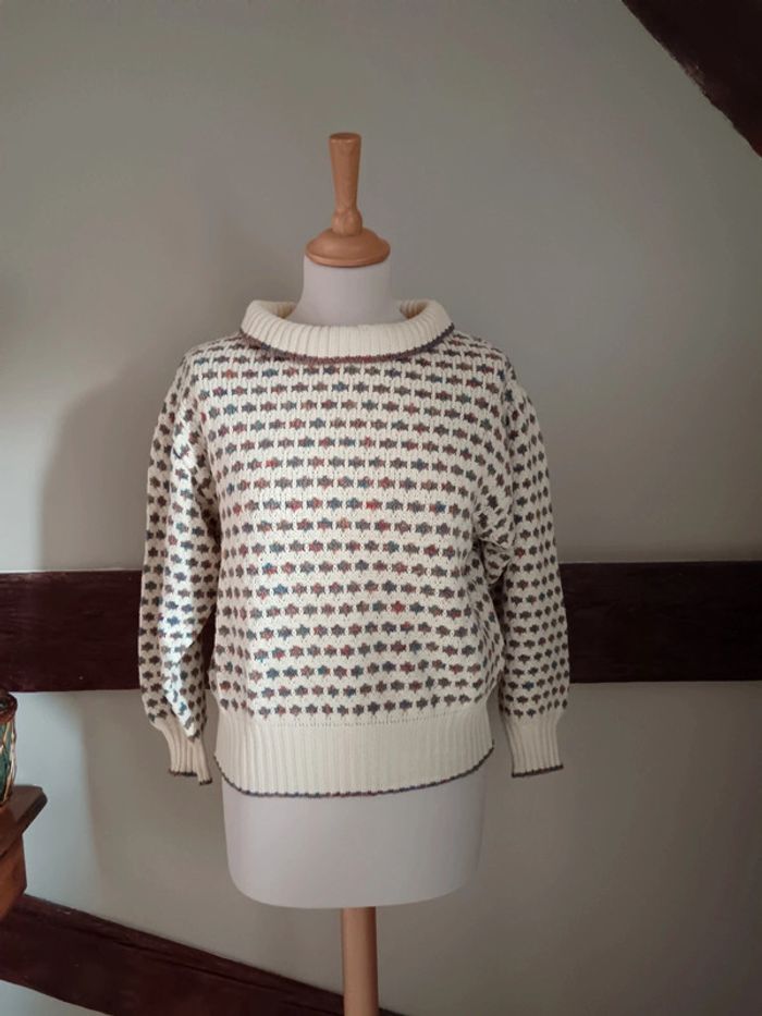 Pas d'envoi Vinted go, merci - ✨ Pull court et ample, large col montant à rabattre, épaules bouffantes et manches larges gigot Couleur crème à détails rouges oranges bleus Rodier Paris, made in France, vintage années 80 65% laine 35% acrylique État impeccable Taille 34, je le porte sur un 36 sur les photos et mesure 1m61 📏 Dimensions à plat : largeur poitrine 47cm, longueur 53cm, longueur manches à partir du col 63cm ⚠️ Étant une entreprise déclarée payant des charges, merci de respecter mon travail en ne le bradant pas 🙏 #desibellesfripes34