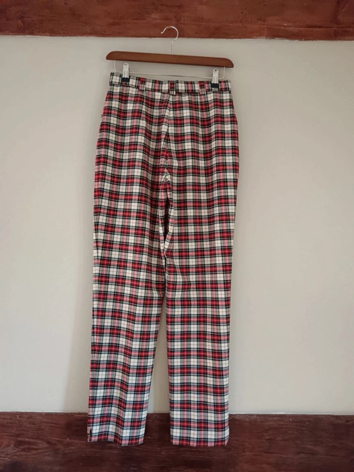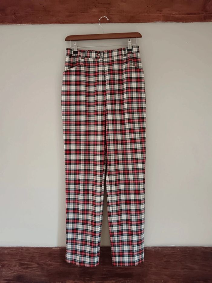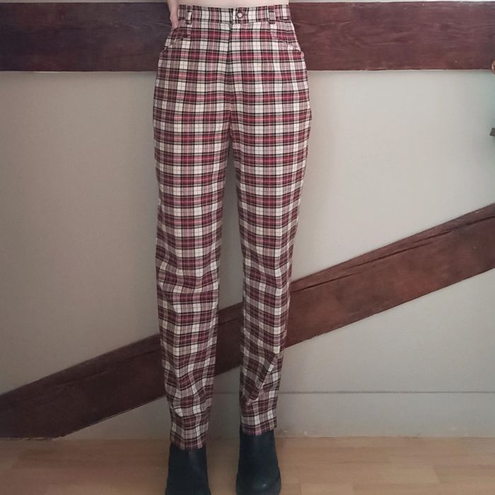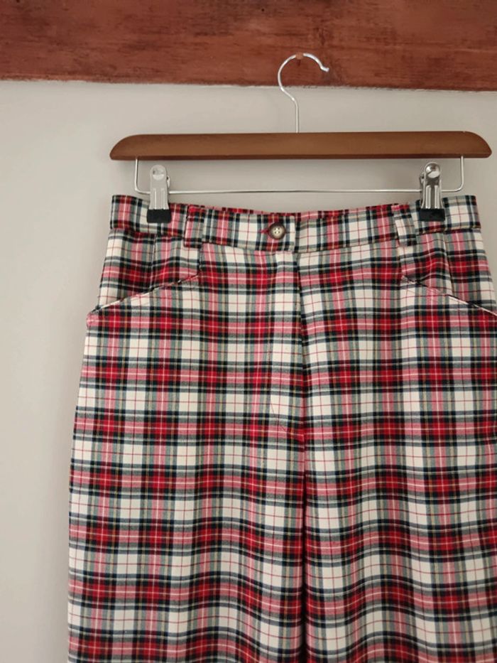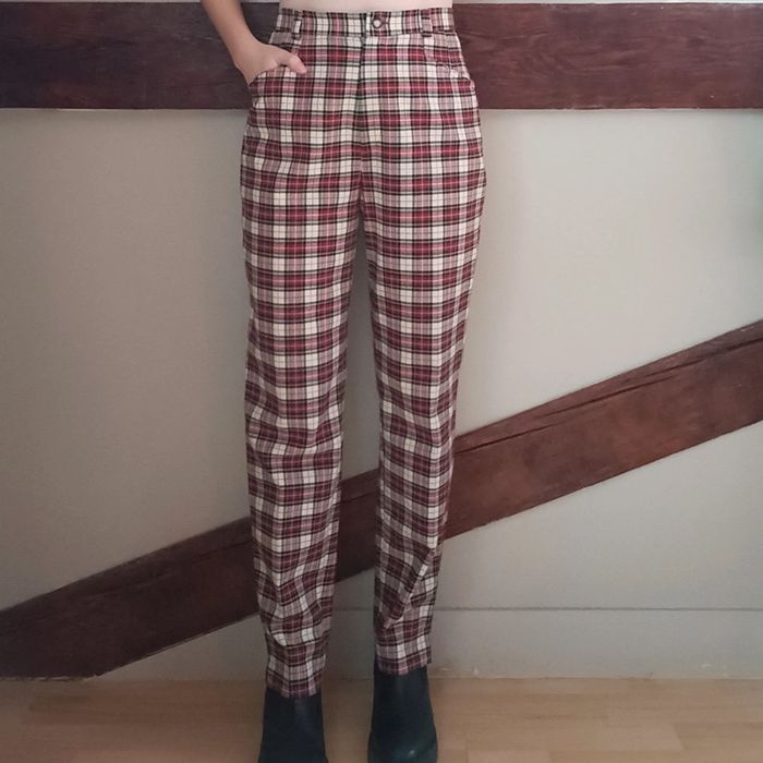 Pas d'envoi Vinted go, merci - ✨ Pantalon vintage années 90 taille haute à pinces, jambe droite, motif carreaux tartan rouge noir jaune crème Aucune étiquette, belle qualité de confection La matière est agréable et non synthétique, légèrement extensible Très bon état Taille 36, ma taille sur les photos et je mesure 1m61 📏 Dimensions à plat : largeur taille 35cm, fourche 29cm, largeur hanches 50cm, longueur totale 98cm #desibellesfripes36