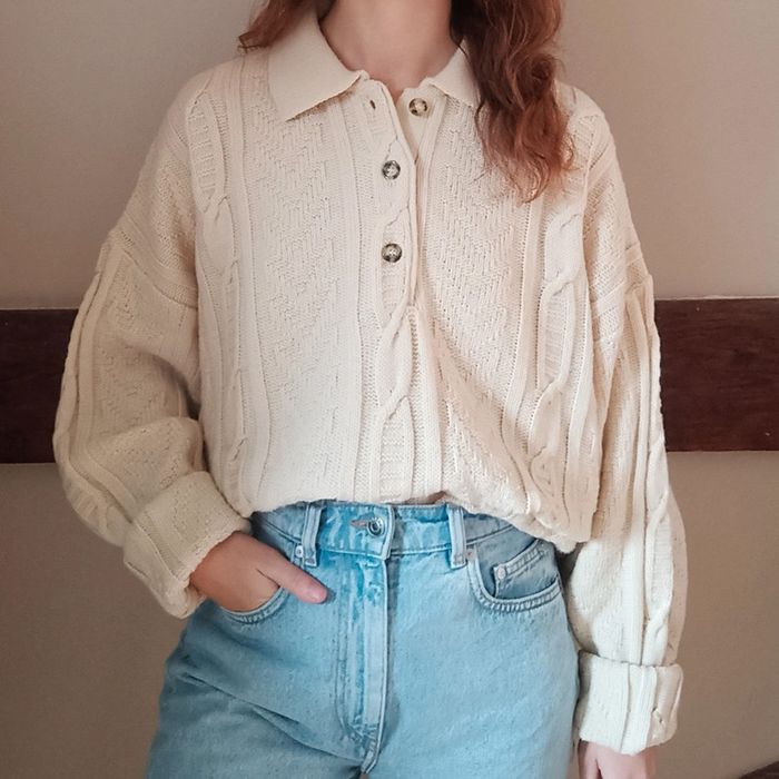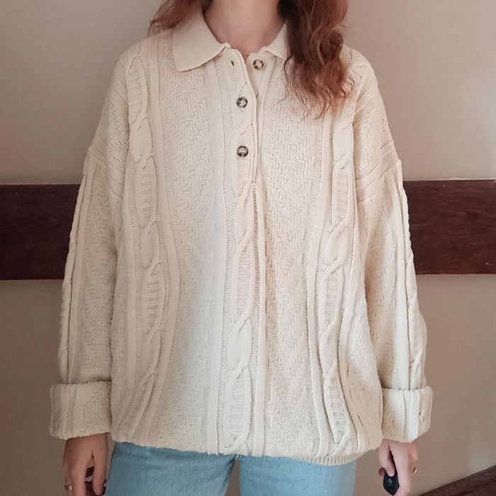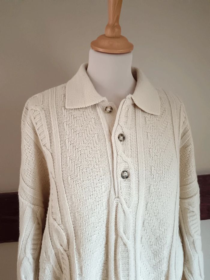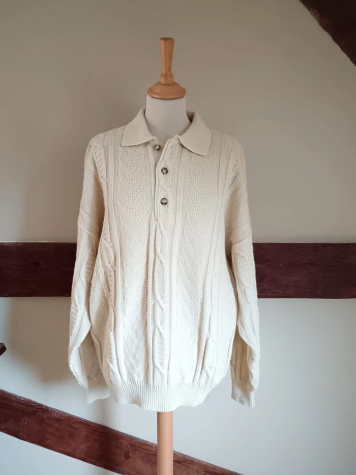 Pas d'envoi Vinted go, merci - ✨ Gros pull couleur crème à col polo boutonné, détails torsades, style Irlandais Old River, made in Italy 50% laine 50% acrylique Très bon état Taille 40 homme ok 42 à 44 femme, je le porte sur un 36 sur les photos et mesure 1m61 📏 Dimensions à plat : largeur poitrine 60cm, longueur 65cm ❗ Étant une entreprise déclarée payant des charges, merci de respecter mon travail en ne le bradant pas 🙏 #desibellesfripes42