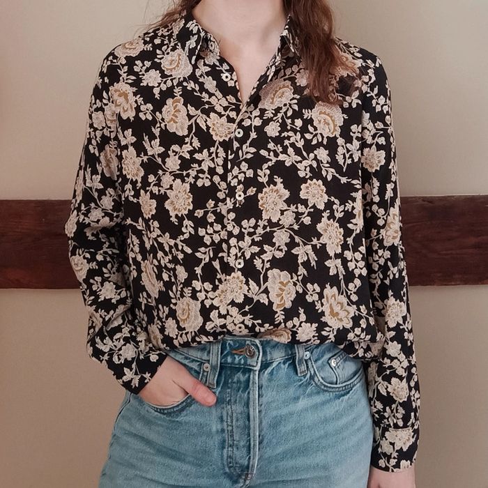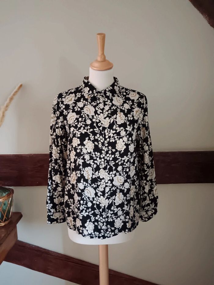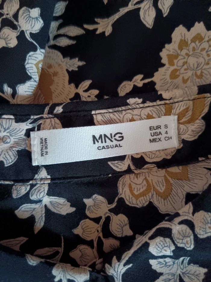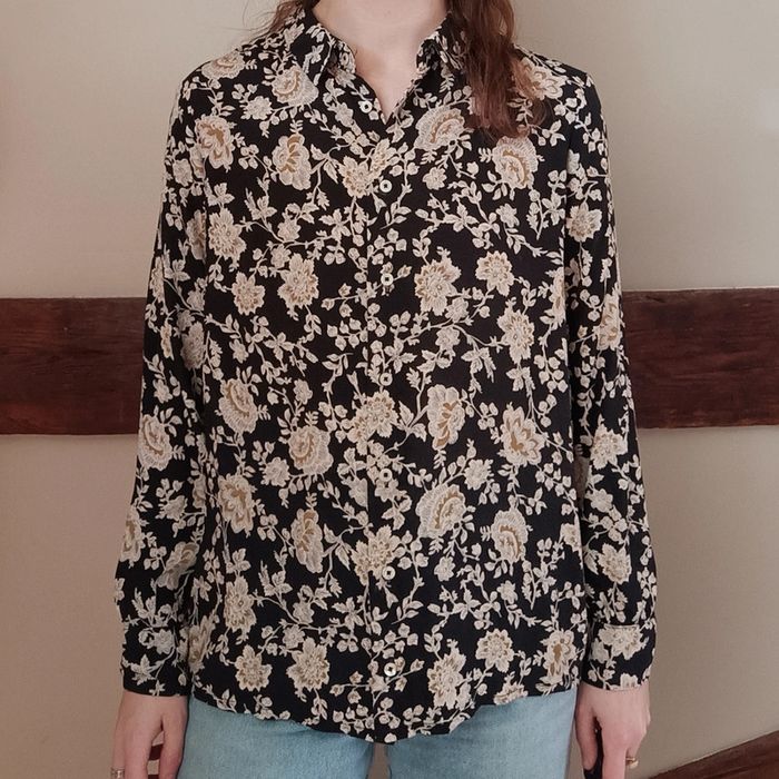 ✨ Chemisier basique fluide noir à fleurs beiges Mango 100% viscose État impeccable Taille 36 Je le porte sur un 36 sur les photos et mesure 1m61 📏 Dimensions à plat : carrure 36cm, largeur poitrine 50cm, longueur 62cm ⚠️ Étant une entreprise déclarée payant des charges, merci de respecter mon travail en ne le bradant pas 🙏 #desibellesfripes36