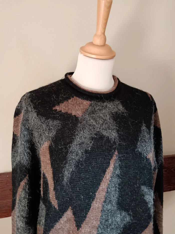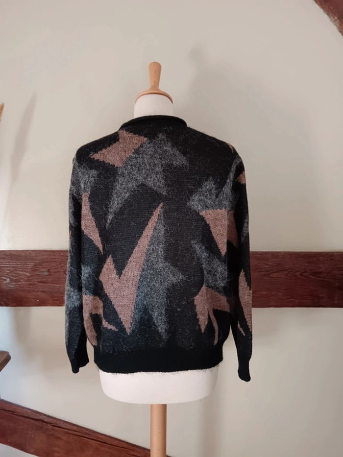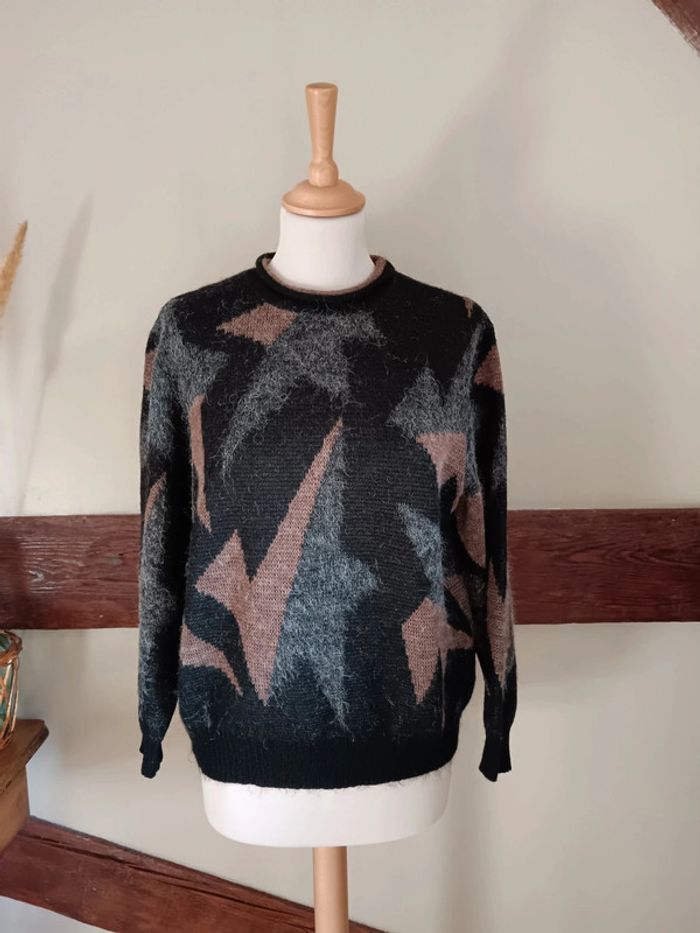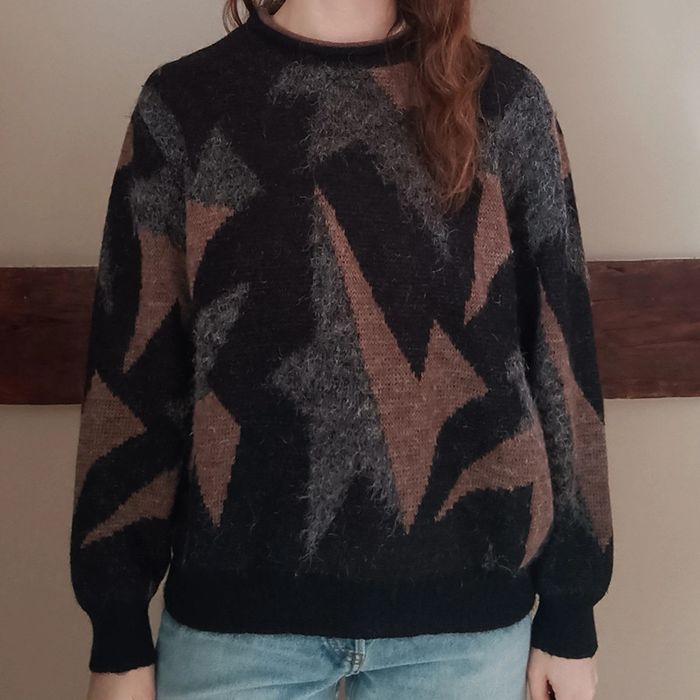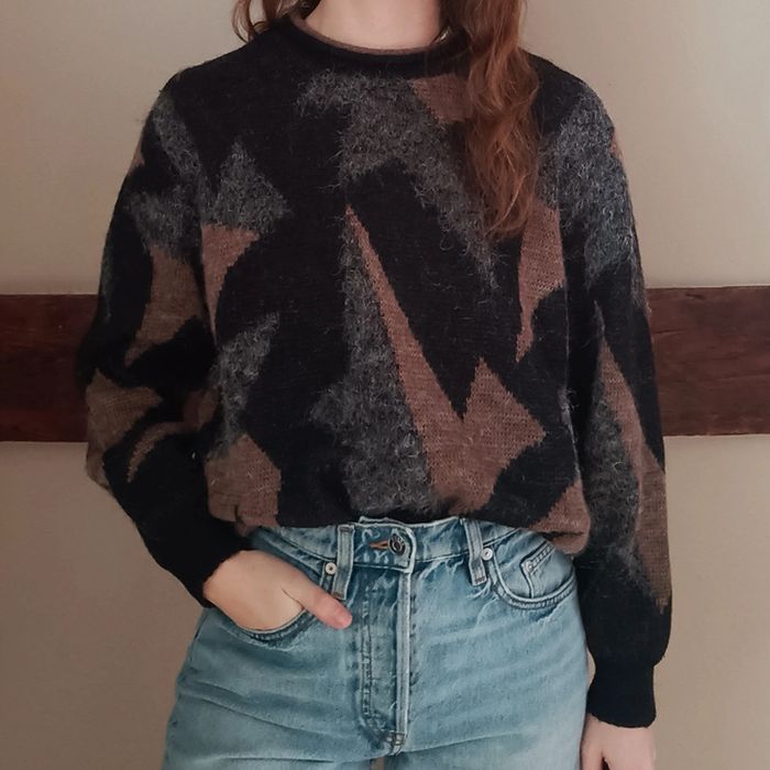 Pas d'envoi Vinted go, merci - ✨ Pull circa années 80 à motifs géométriques abstraits marron noir et gris, le gris étant agrémenté d'un fil donnant un aspect métallisé 64% acrylique 20% polyamide 16% laine Très bon état Taille 36 Je le porte sur un 36 sur les photos et mesure 1m61 📏 Dimensions à plat : largeur poitrine 54cm, longueur 56cm, longueur manches 52cm ⚠️ Étant une entreprise déclarée payant des charges, merci de respecter mon travail en ne le bradant pas 🙏 #desibellesfripes36