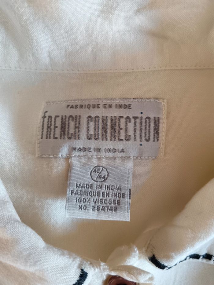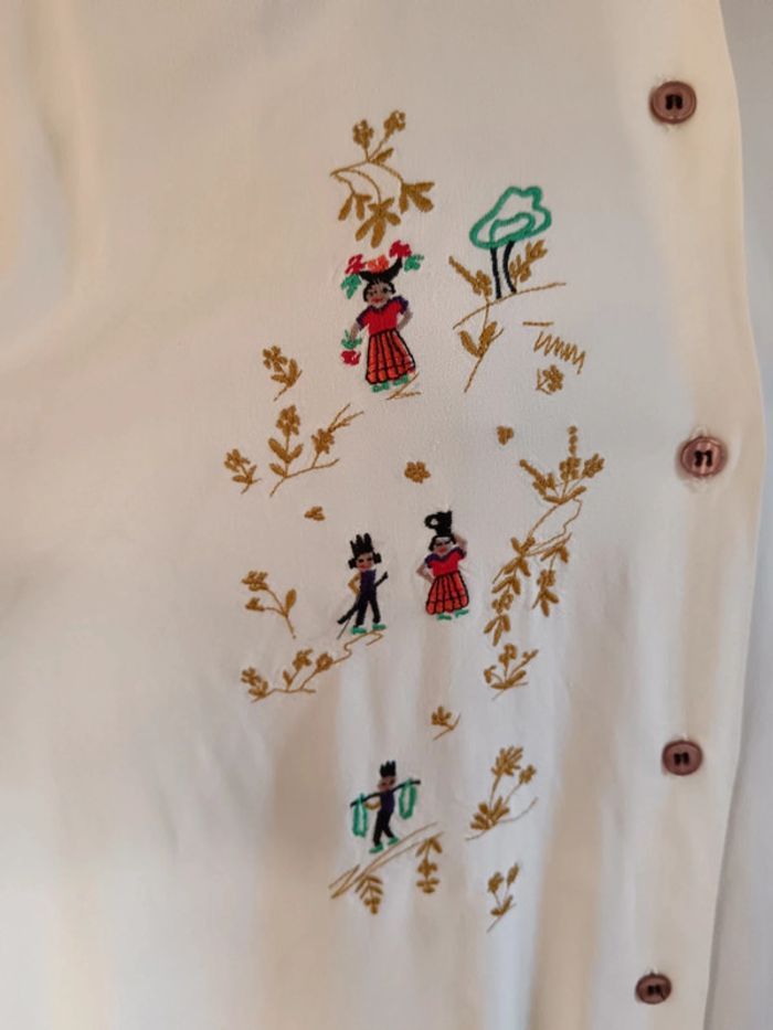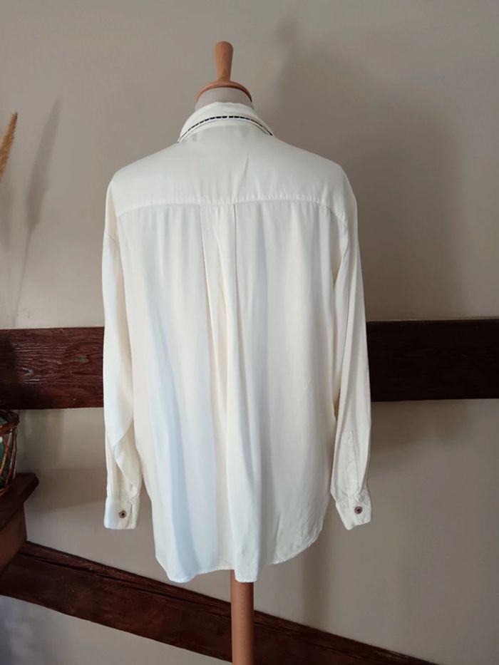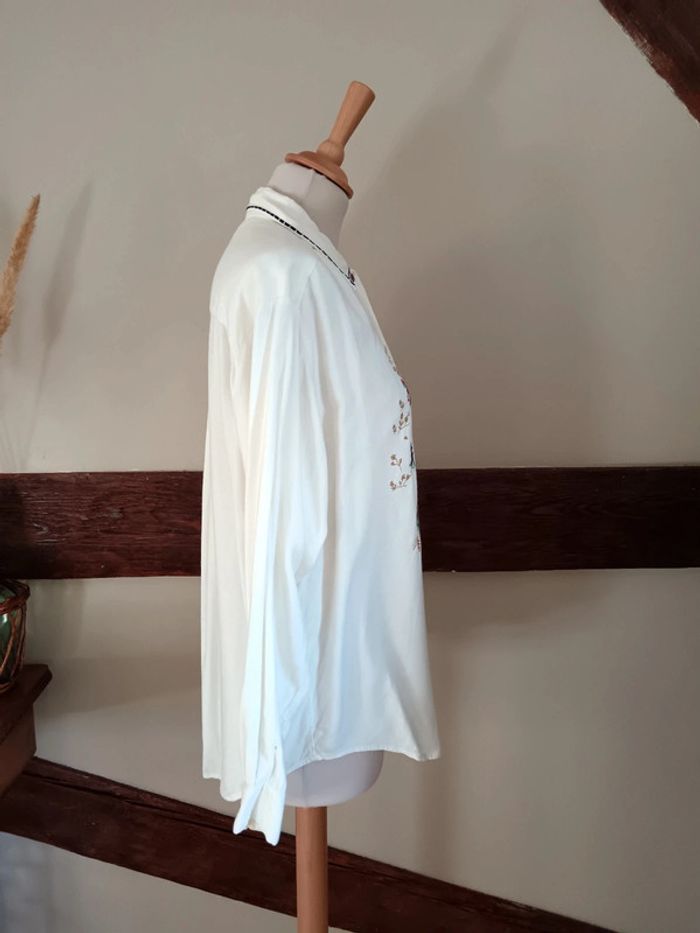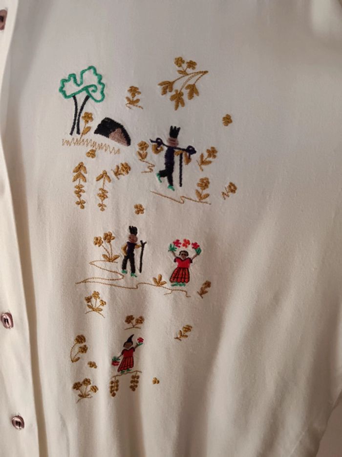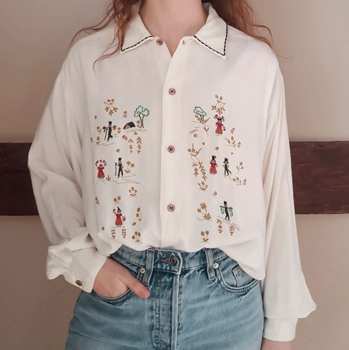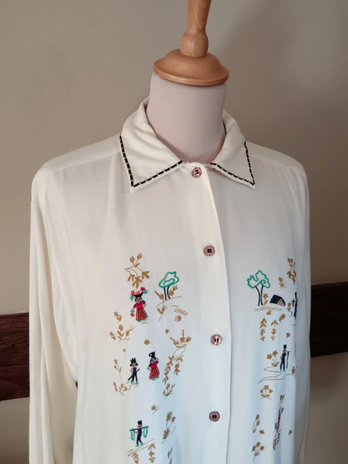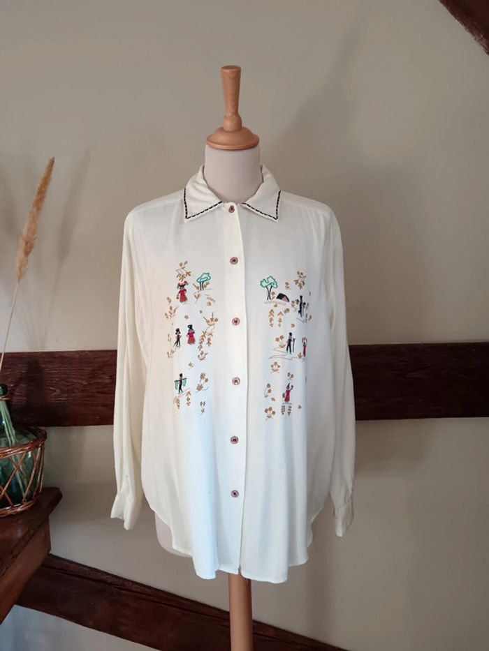 Pas d'envoi Vinted go, merci - ✨ Superbe chemisier crème à petits personnages de scènes paysannes brodés dans un style Autrichien, Tyrolien French connection vintage, made in India 100% viscose très beau tissus épais État impeccable Taille 42/44 Je le porte sur une taille 36 sur les photos 📏 Dimensions à plat : carrure 46cm, largeur poitrine 61cm, longueur 70cm #desibellesfripes44