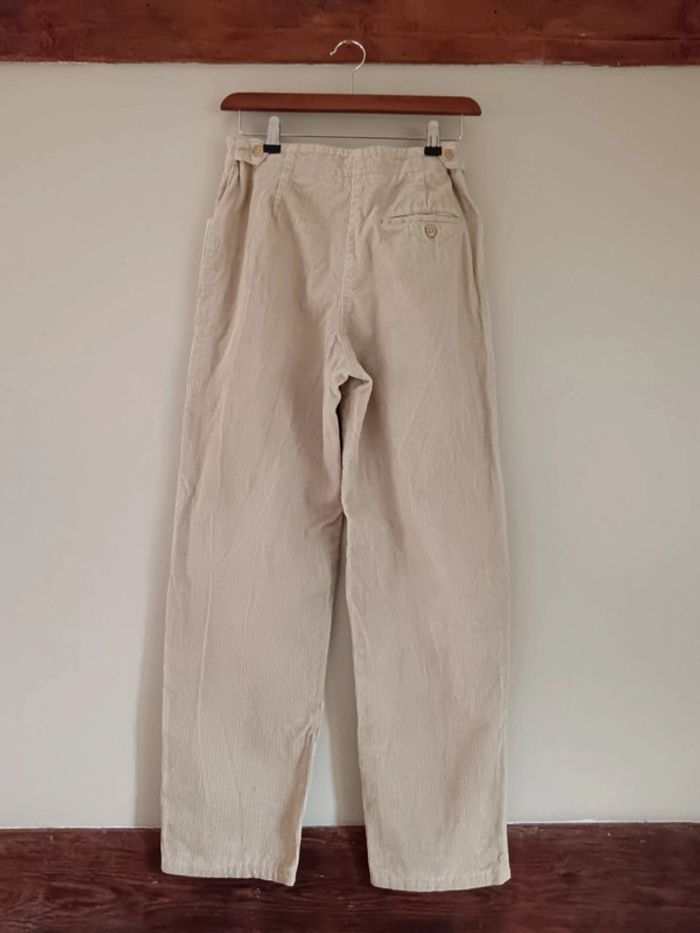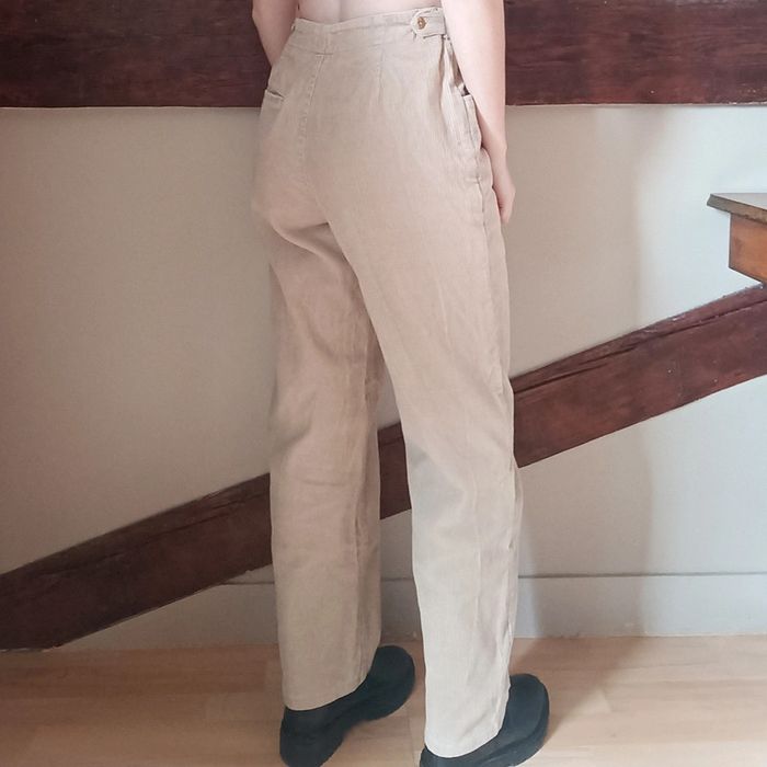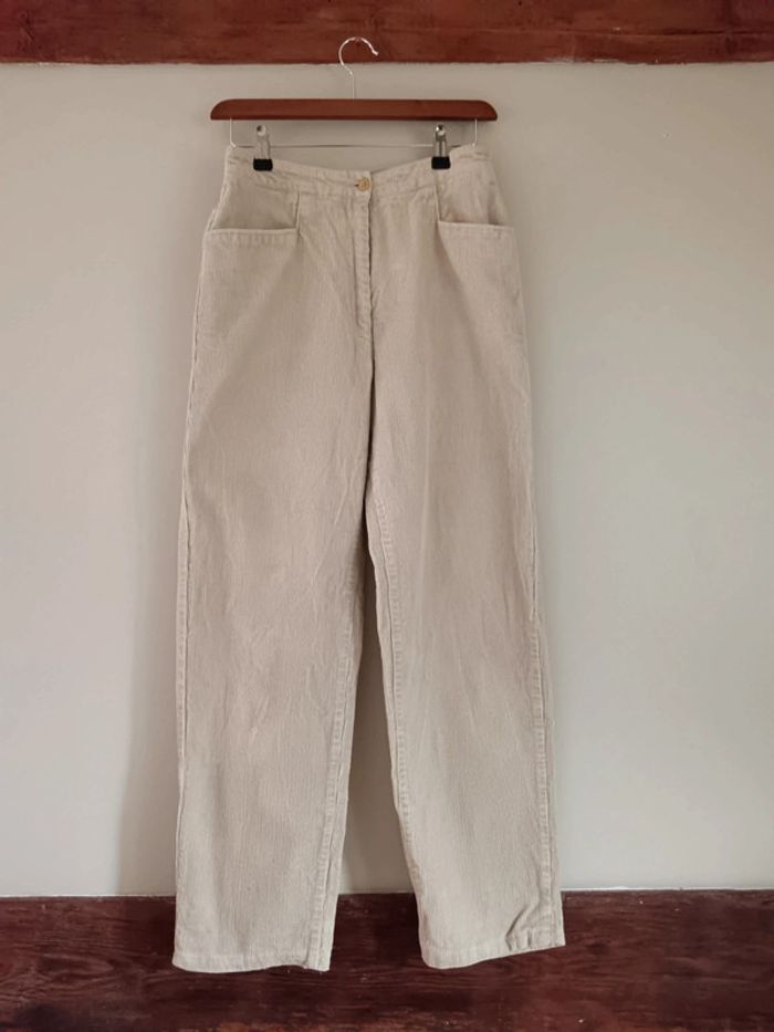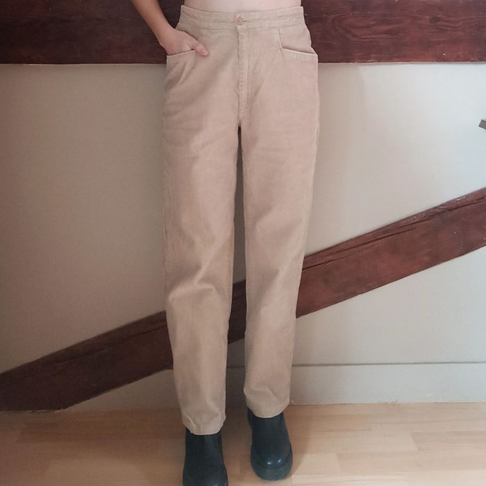 Pas d'envoi Vinted go, merci - ✨ Pantalon taille haute en velours côtelé beige Bensimon vintage 100% coton État satisfaisant, un petit trou est à noter sous le genou droit ainsi que de petites tâches sur le bas du pantalon (voir les dernières photos) Taille 40 sur étiquette mais conviendra plutôt à une taille 36 actuelle, éventuellement 38 taille fine La largeur à la taille peut être réglée sur deux positions grâce à des boutons au dessus des hanches Je le porte sur un 36 sur les photos et mesure 1m61 📏 Dimensions à plat : largeur taille ajustable à 33 ou 35cm, fourche 29cm, hanches 52cm, longueur totale 99cm, longueur à partir de l'entrejambe 71cm ⚠️ Étant une entreprise déclarée payant des charges, merci de respecter mon travail en ne le bradant pas 🙏 #desibellesfripes36