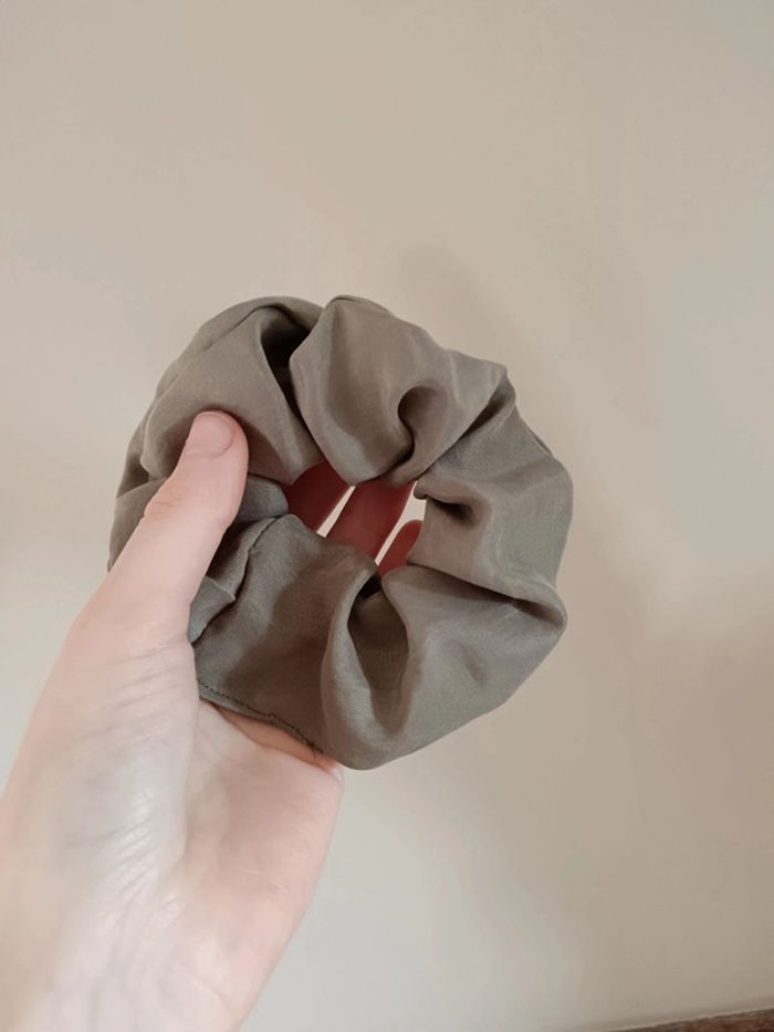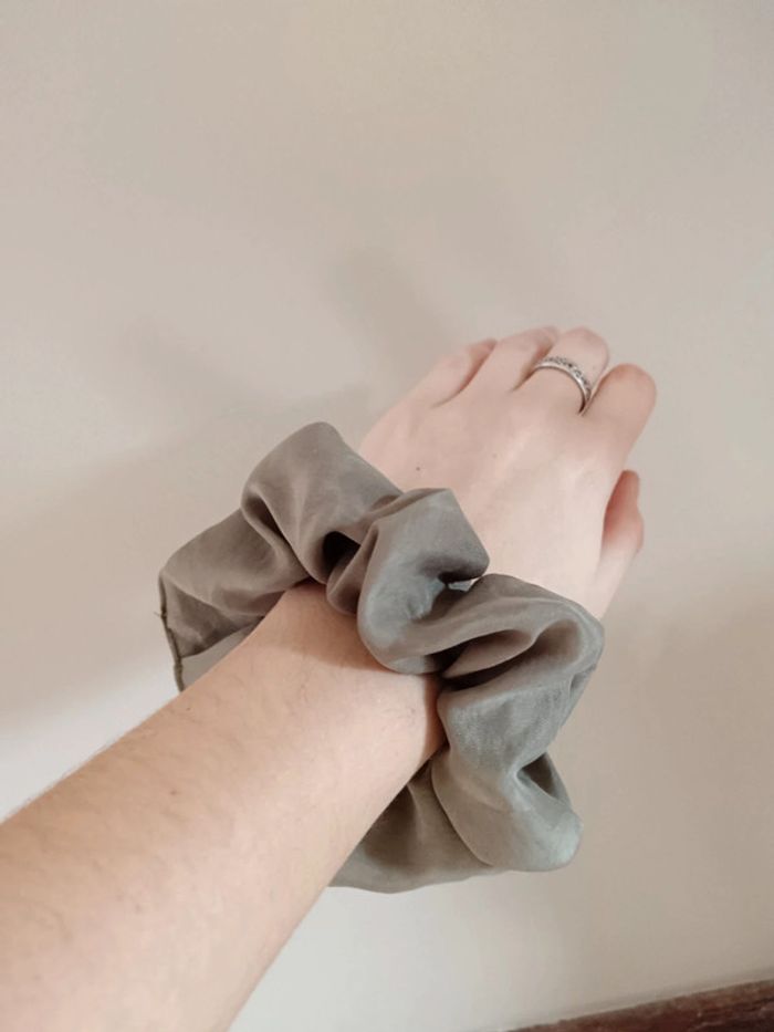 Chouchou ou scrunchie en pure soie à porter au poignet ou dans les cheveux Coloris vert sauge Réalisé main, upcyclé à partir d'un chemisier en soie vintage Diamètre total environ 11cm