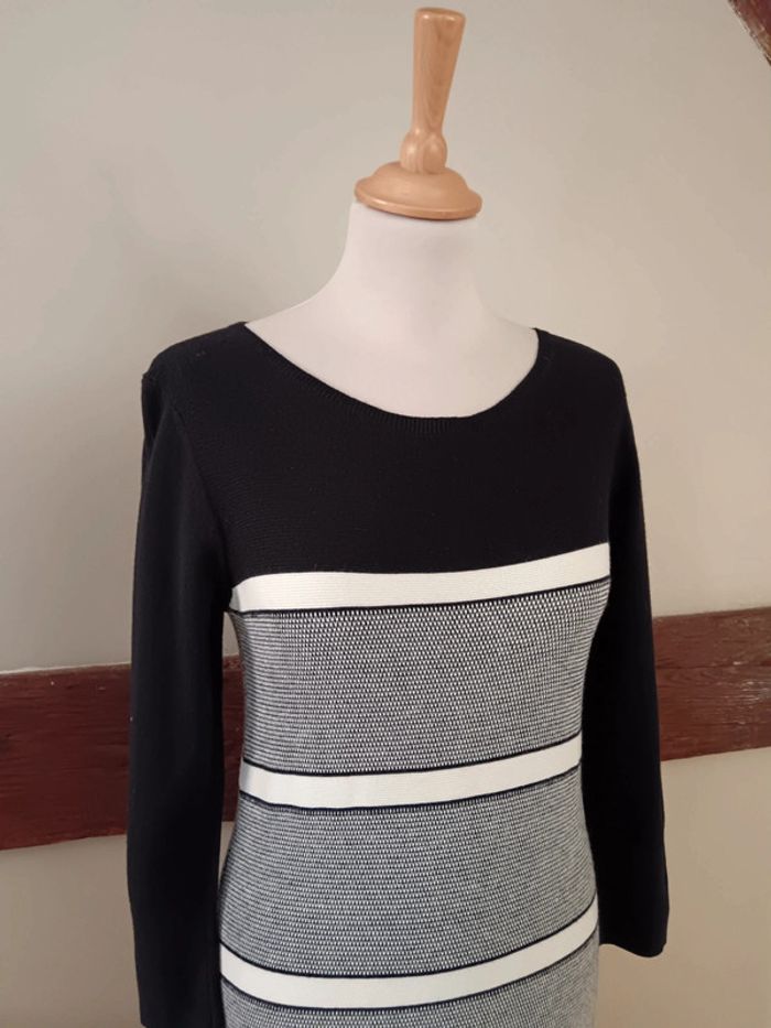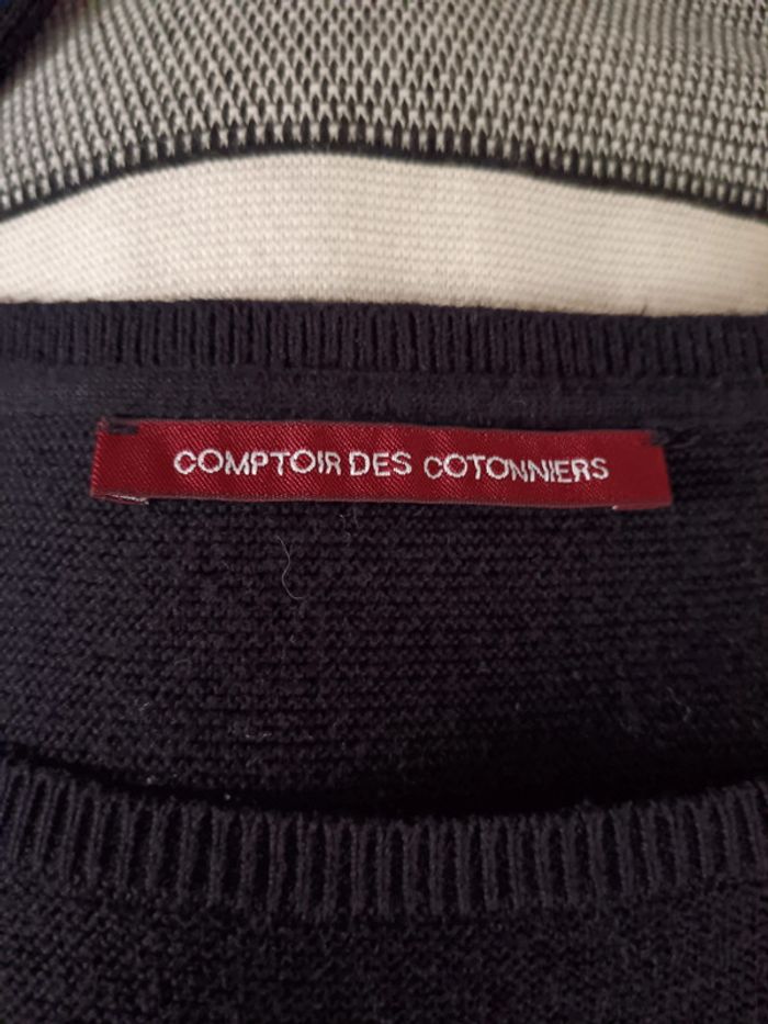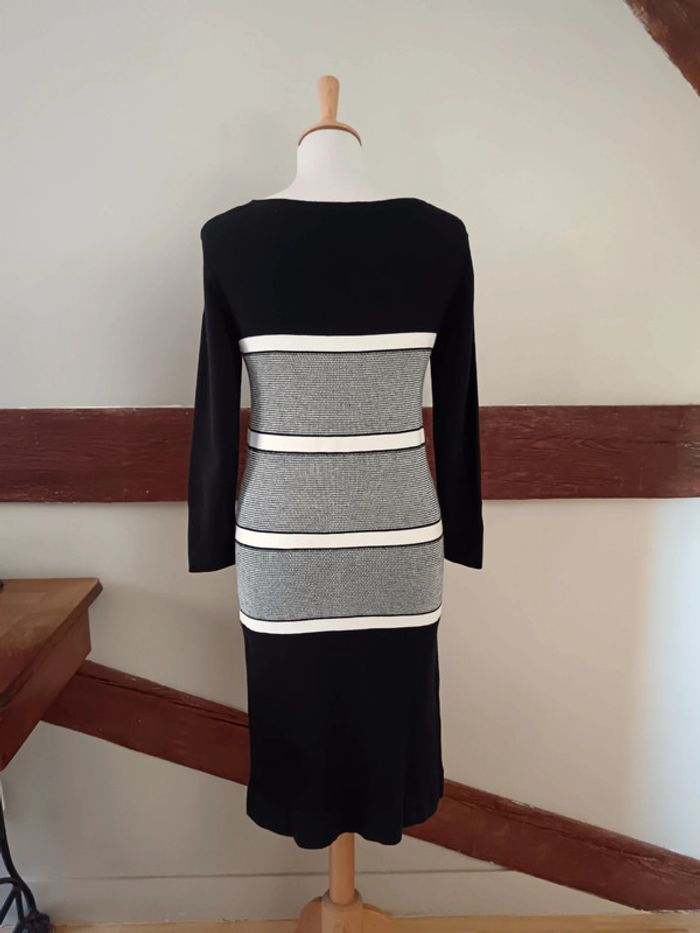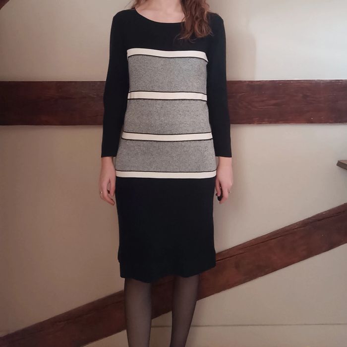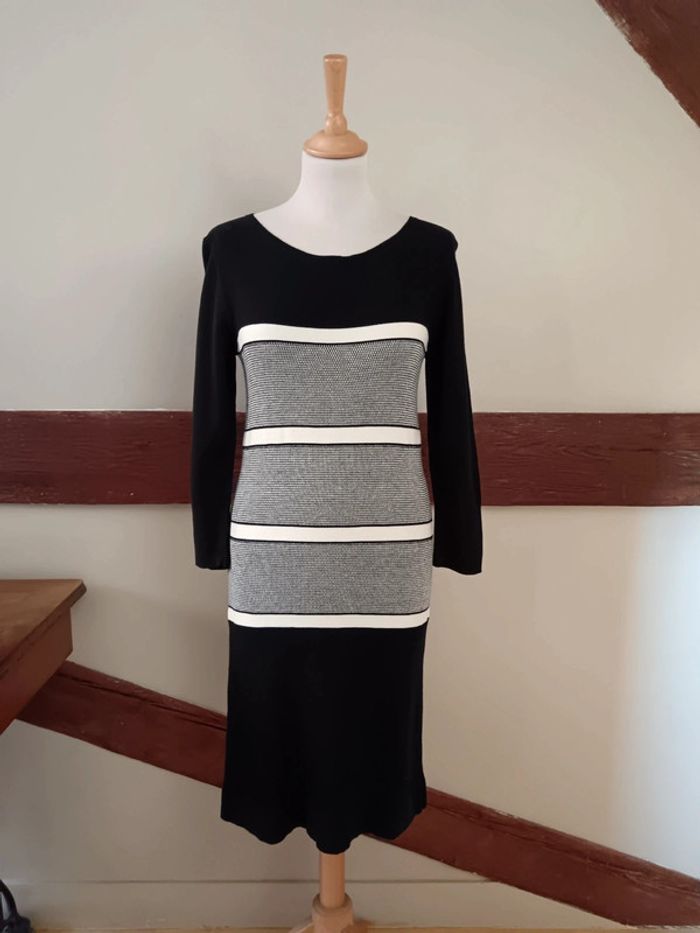 Pas d'envoi Vinted go, merci - ✨ Robe pull maille fine, mi longue et manches entre longues et 3/4 Coloris noire, blanche et grise à rayures Comptoir des Cotonniers, modèle Seabay 45% coton 35% viscose 10% polyamide 5% laine 5% cachemire État impeccable Taille 36 Je la porte sur un 36 sur la photo et mesure 1m61 📏 Dimensions à plat : carrure 41cm, largeur poitrine extensible jusqu'à 47cm, longueur 97cm, longueur manches 50cm ⚠️ Étant une entreprise déclarée payant des charges, merci de respecter mon travail en ne le bradant pas 🙏 #desibellesfripes36