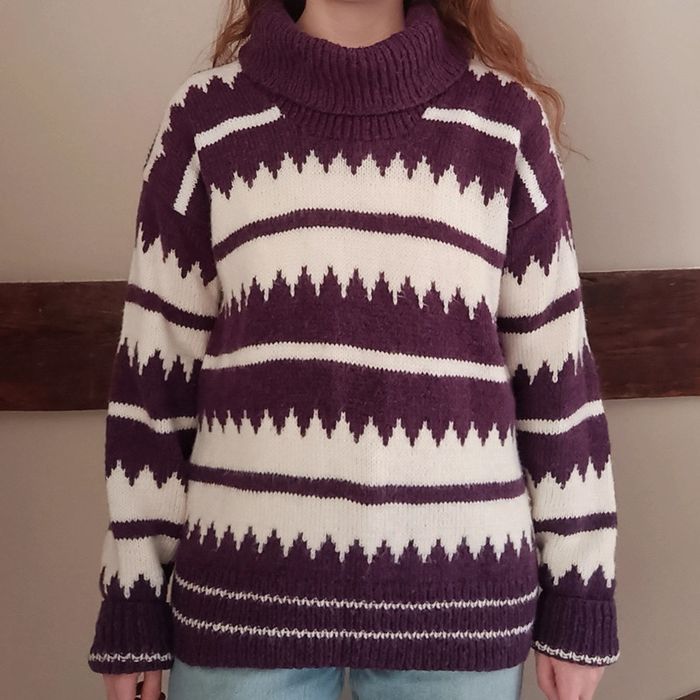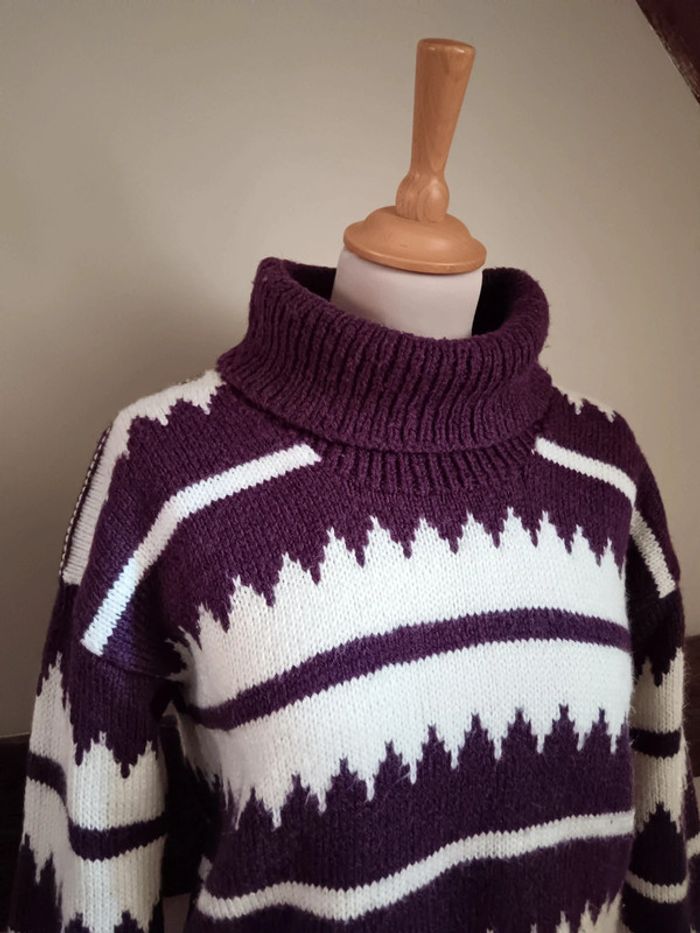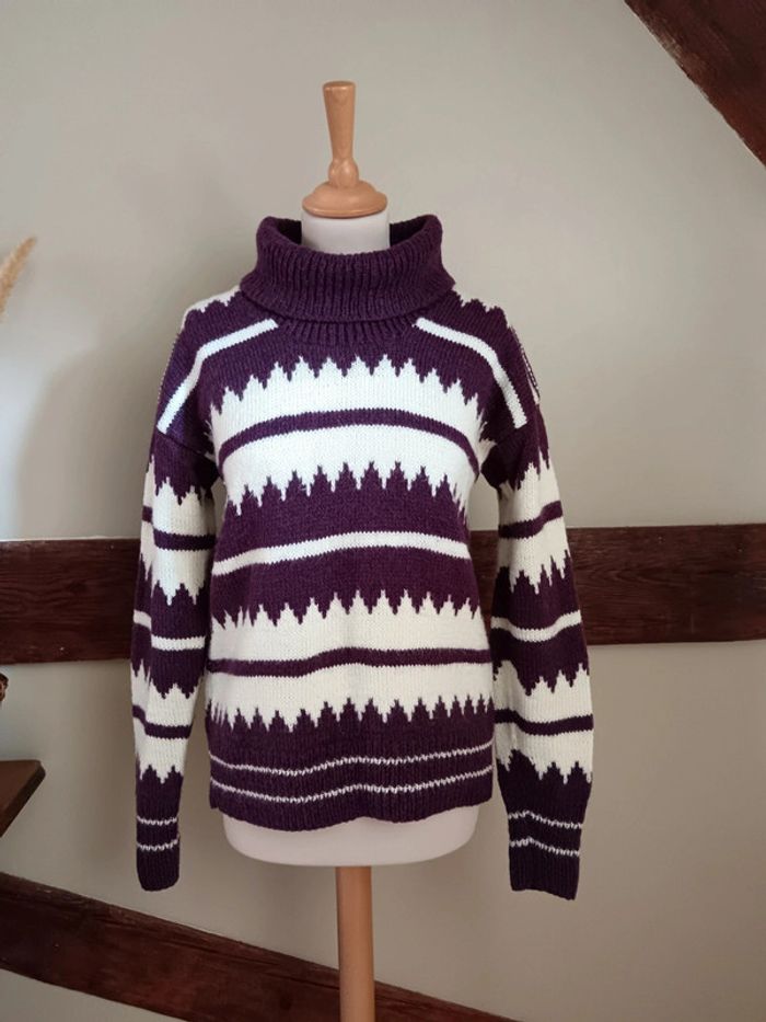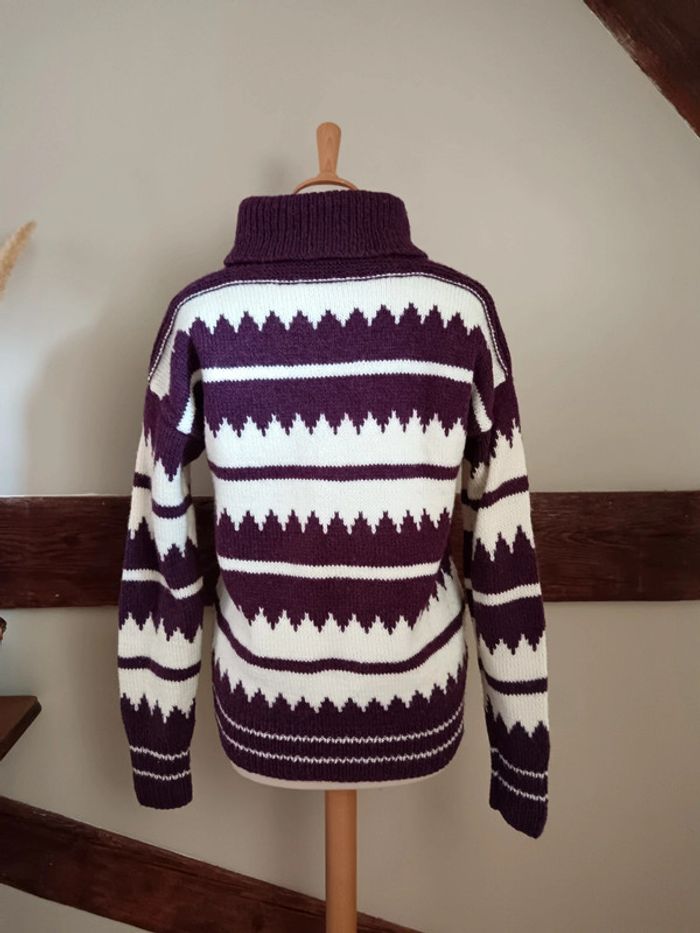 Pas d'envoi Vinted go, merci - ✨ Pull à gros col roulé type pull de ski, blanc à motifs violets Tricoté main Grosse maille acrylique Très bon état Taille 38 ample ou 40 proche du corps Je le porte sur un 36 sur les photos et mesure 1m61 📏 Dimensions à plat : largeur poitrine 50cm, longueur 62cm ⚠️ Étant une entreprise déclarée payant des charges, merci de respecter mon travail en ne le bradant pas 🙏 #desibellesfripes38 #desibellesfripes40