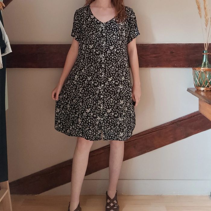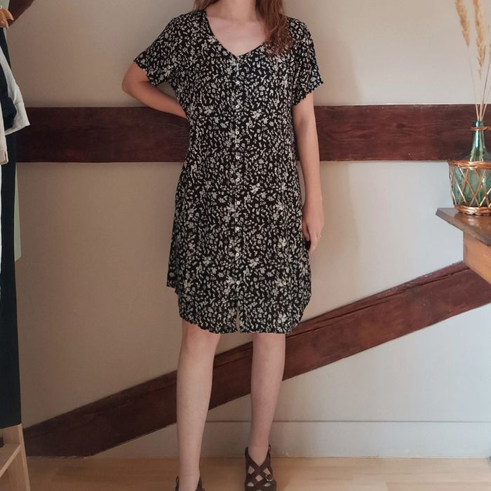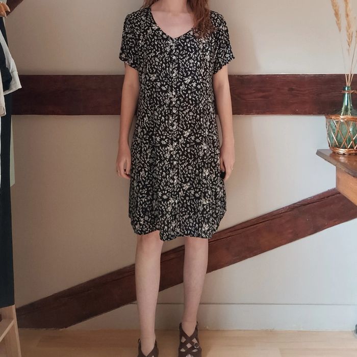 💐 Réductions sur les lots 💐 2 articles : -5% 3 & 4 articles : -10% 5 articles et plus : -15% ⚠️ Pas d'envoi Vinted go, merci Étant une entreprise déclarée payant des charges, merci de respecter mon travail en ne le bradant pas 🙏 ✨ Robe t-shirt boutonnée ample mi-longue noire motif beige fleuri Agathe Velmont Étiquette coupée, au toucher je pense que c'est de la viscose, tissu léger et fluide Très bon état Taille 42 Je la porte sur un 36 sur les photos et mesure 1m61 📏 Dimensions à plat : largeur poitrine 52cm, longueur 98cm Retrouve moi sur Instagram : de_si_belles_fripes #desibellesfripes42