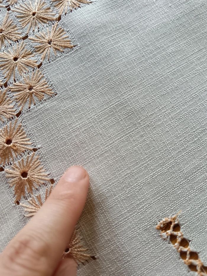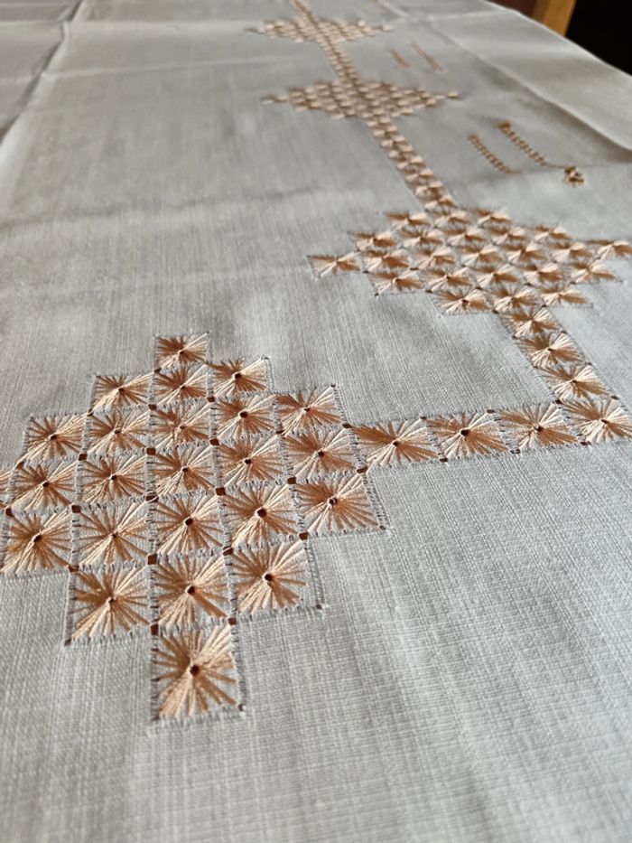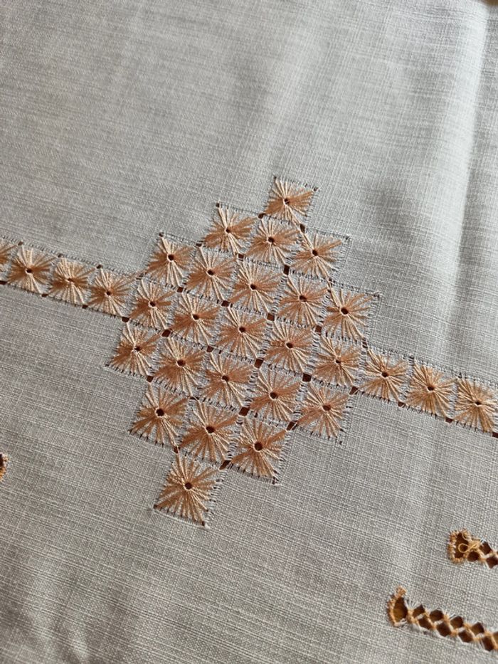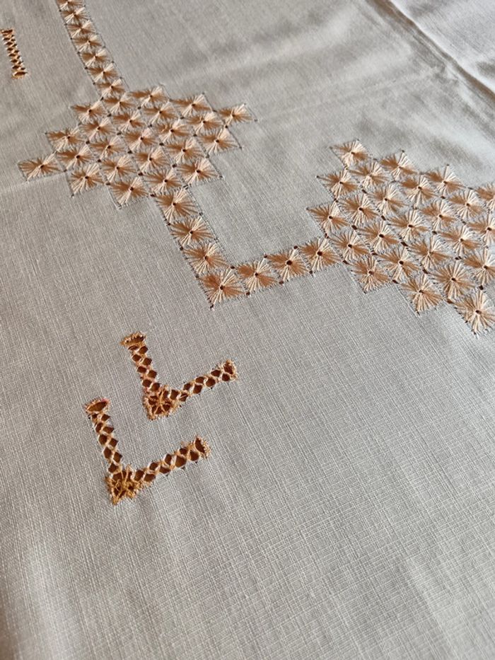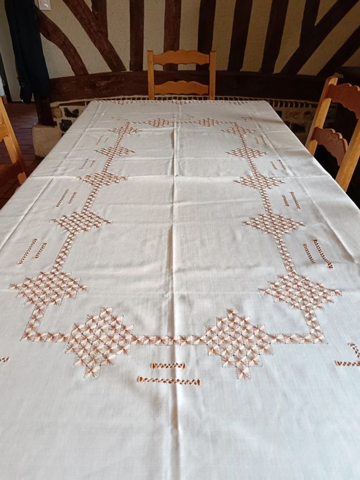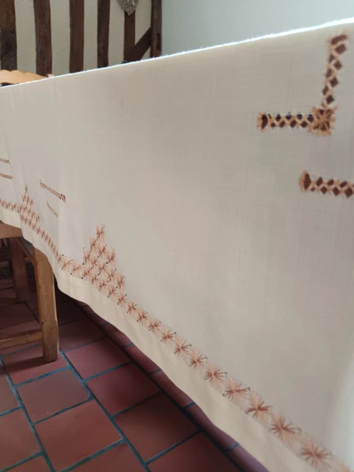 ✨ Nappe couleur crème à broderies beige orangé et points ajourés Aucune étiquette, belle matière non synthétique Très bon état, petite zone avec de très légères traces roses mais peu visible (voir la dernière photo) Dimensions 137cm x 200cm ❗ Étant une entreprise déclarée payant des charges, merci d'éviter les négociations de prix dignes d'un marché aux puces et de respecter mon travail en ne le bradant pas 🙏