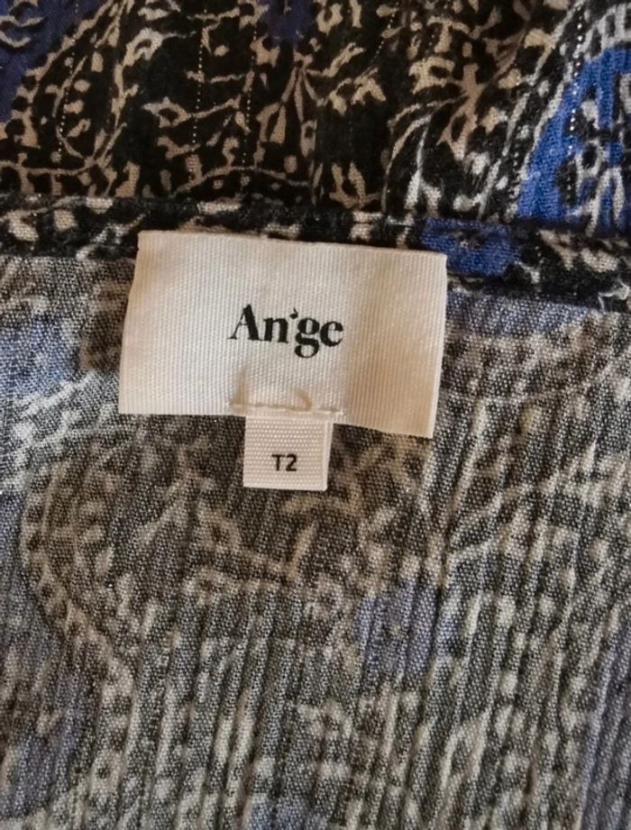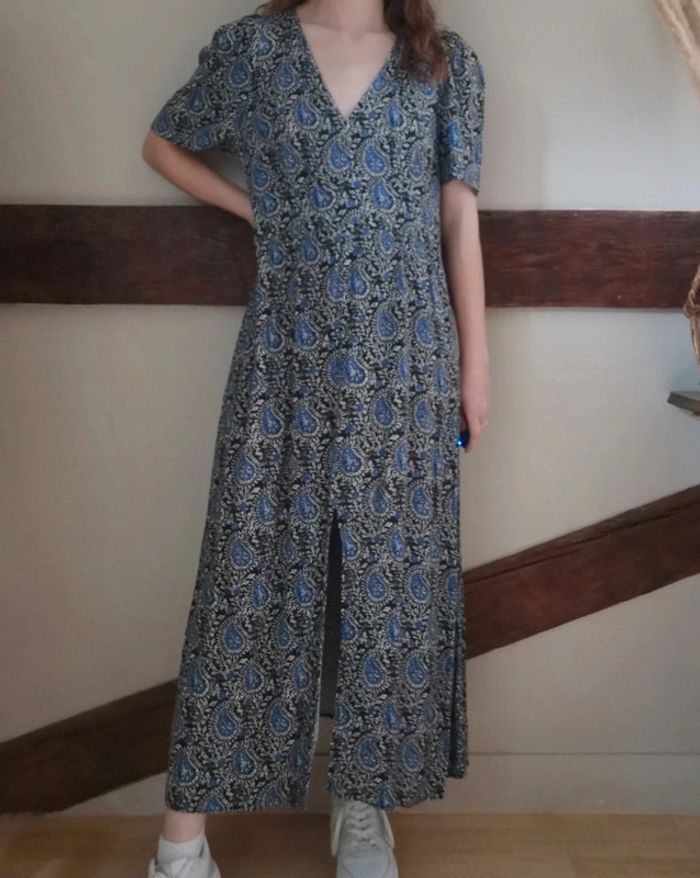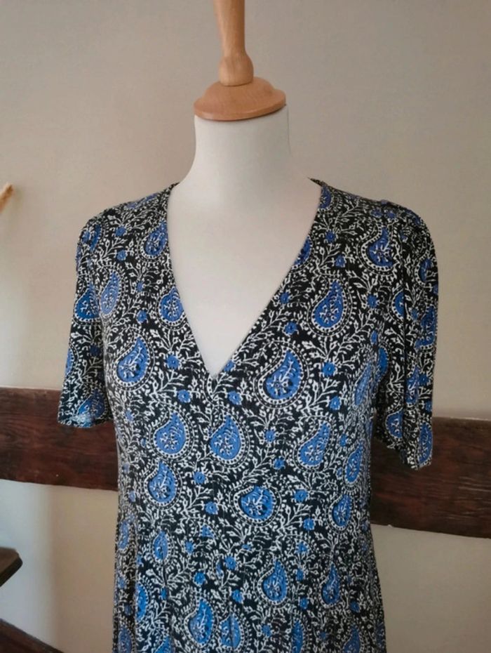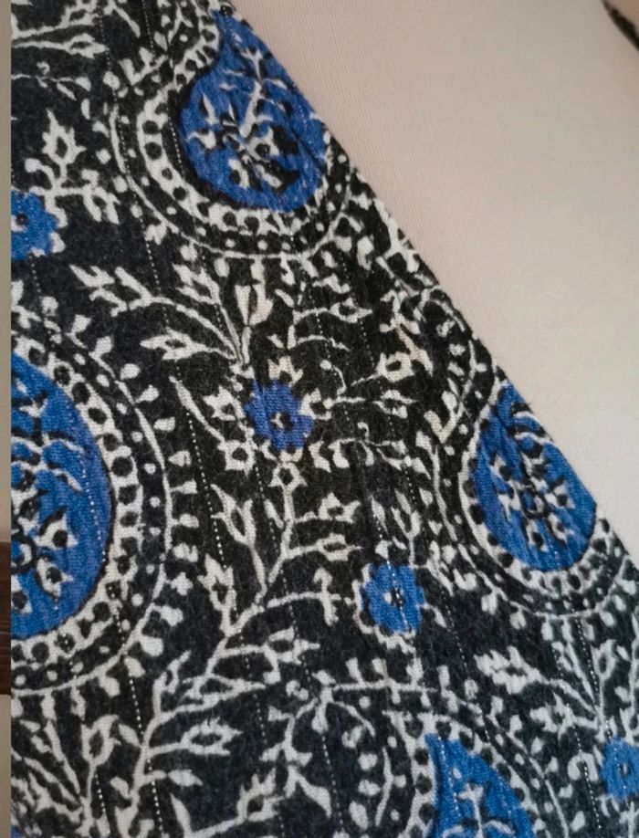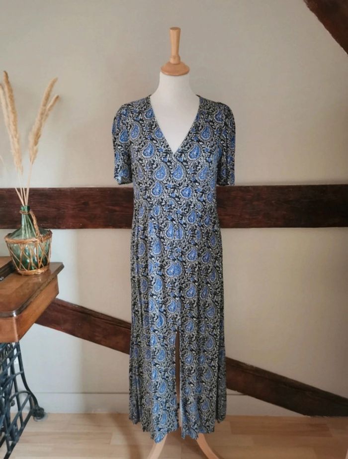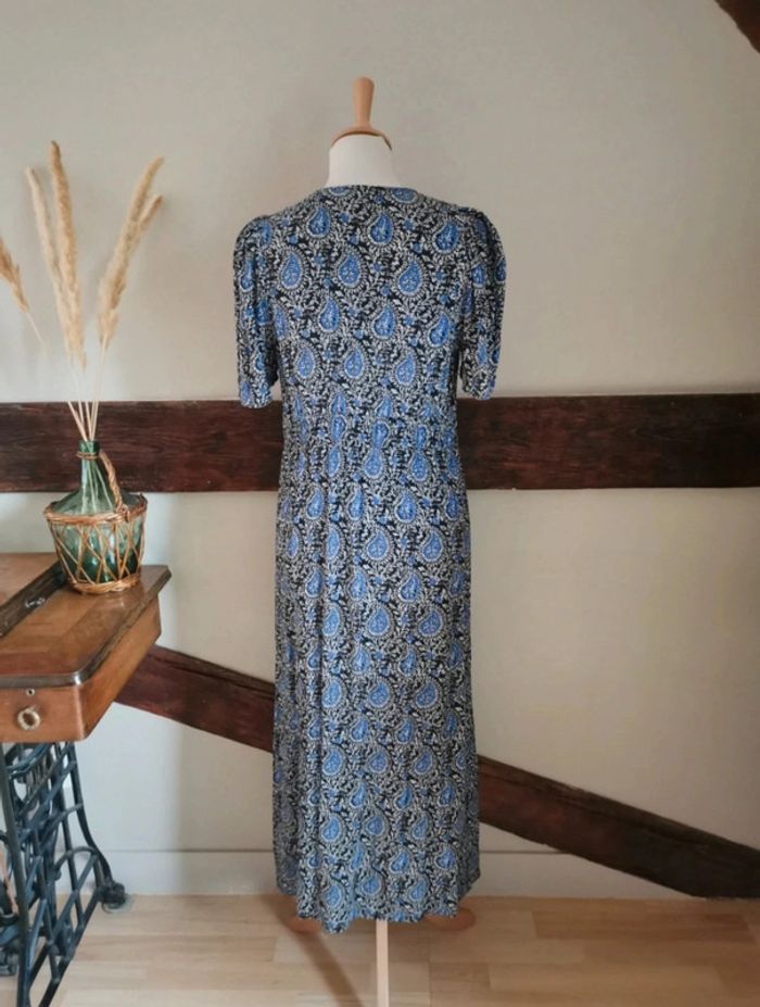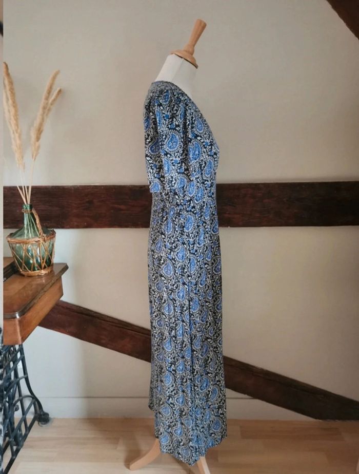 Pas d'envoi Vinted go, merci - ✨ Robe longue manches courtes à col V couleur noire bleu blanche à petits fils pailletés, motif cachemire paisley Taille élastique An'ge 100% viscose Très bon état Taille 38, je la porte sur un 36 sur les photos et mesure 1m61 📏 Dimensions à plat : largeur poitrine 48cm, longueur 126cm #desibellesfripes38 #dsbfbraderie