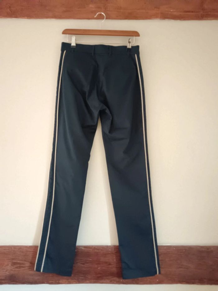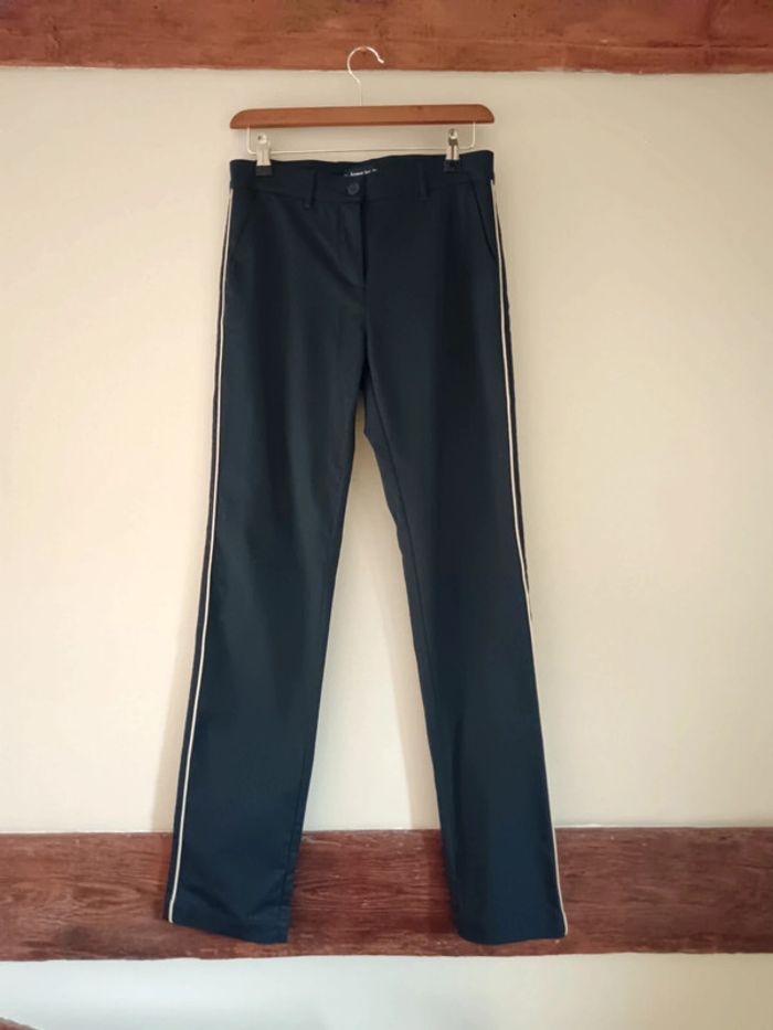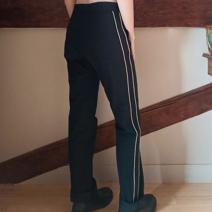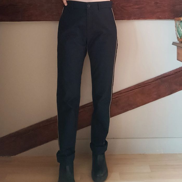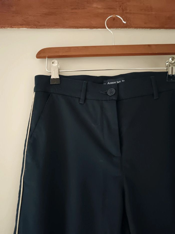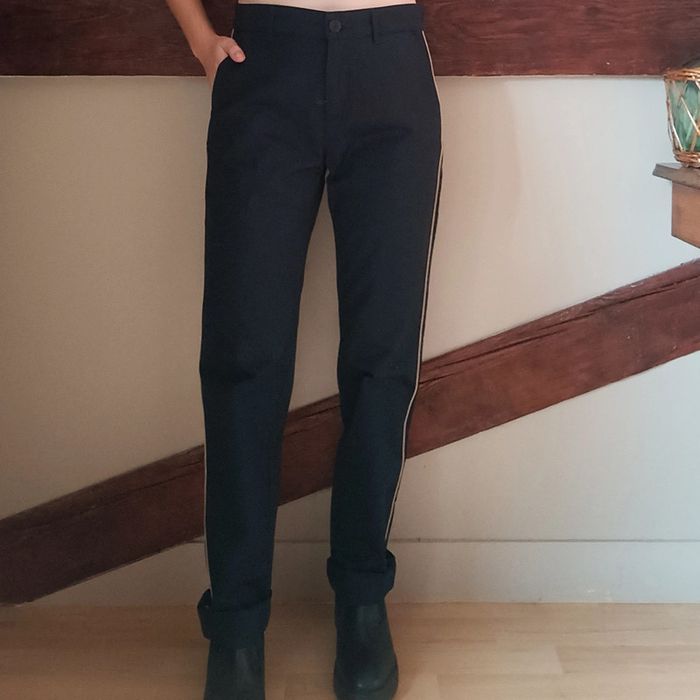 Pas d'envoi Vinted go, merci - ✨ Pantalon chino taille normale coupe droite bleu marine foncé à double liseré crème sur le côté de jambe Aromor-Lux L'étiquette de composition à été coupée, je pense que c'est un mélange coton polyester État impeccable comme neuf Taille 36, je mesure 1m61 sur les photos 📏 Dimensions à plat : largeur taille 37cm, fourche 25cm, hanches 47cm, longueur 105cm ❗ Étant une entreprise déclarée payant des charges, merci de respecter mon travail en ne le bradant pas 🙏 #desibellesfripes36