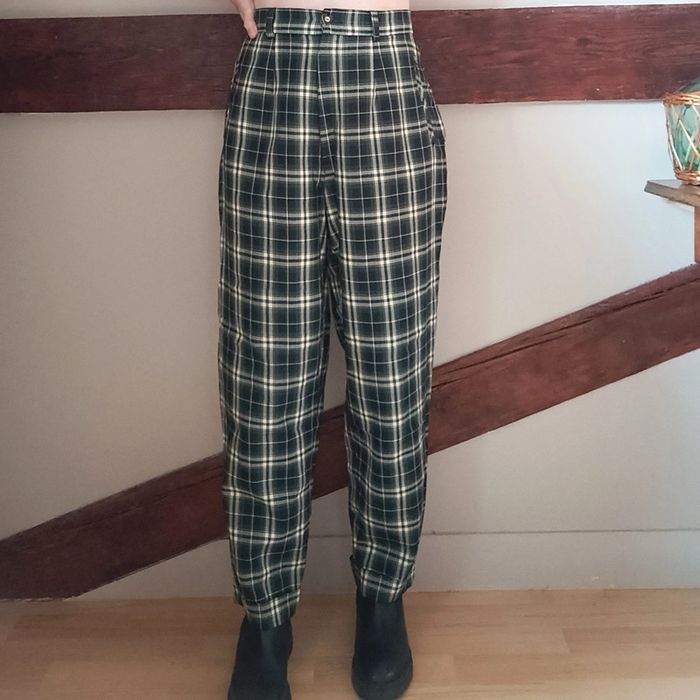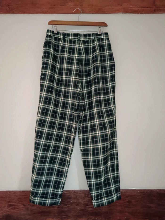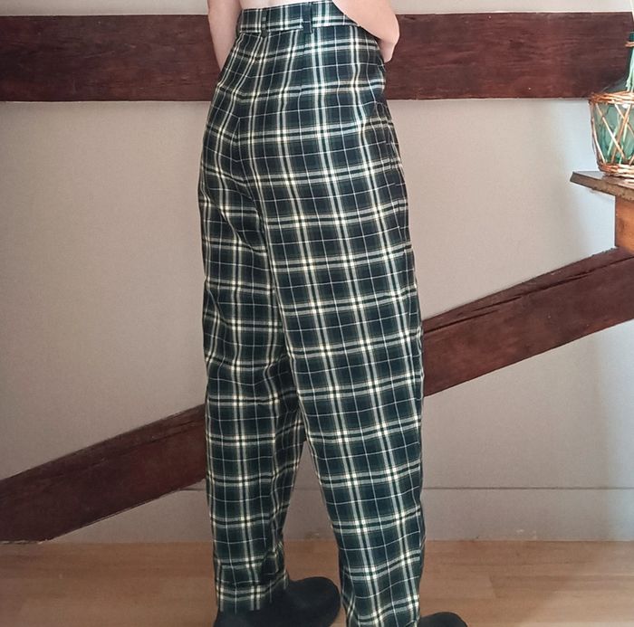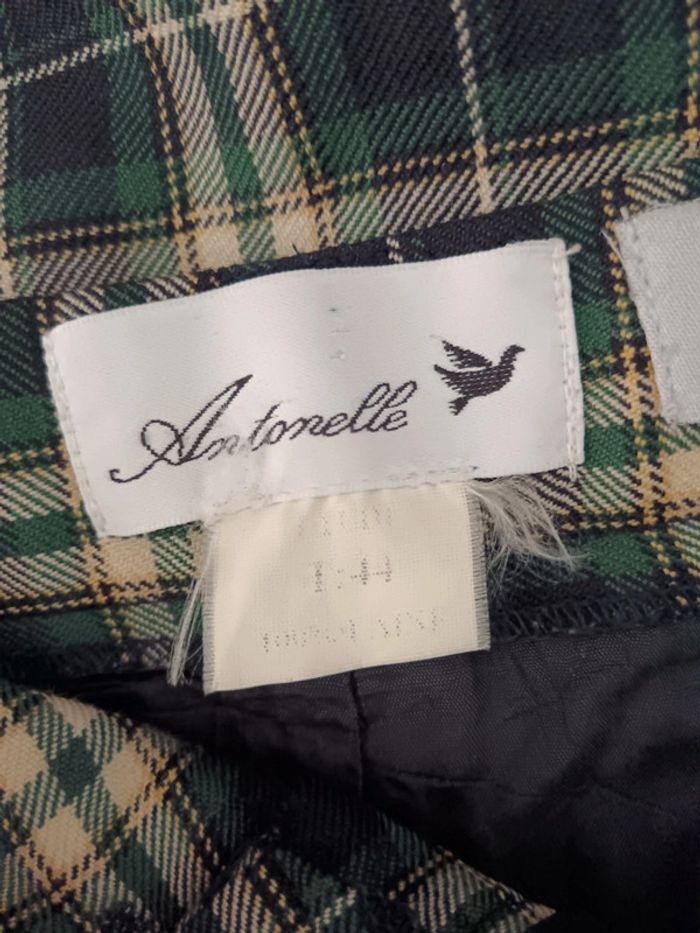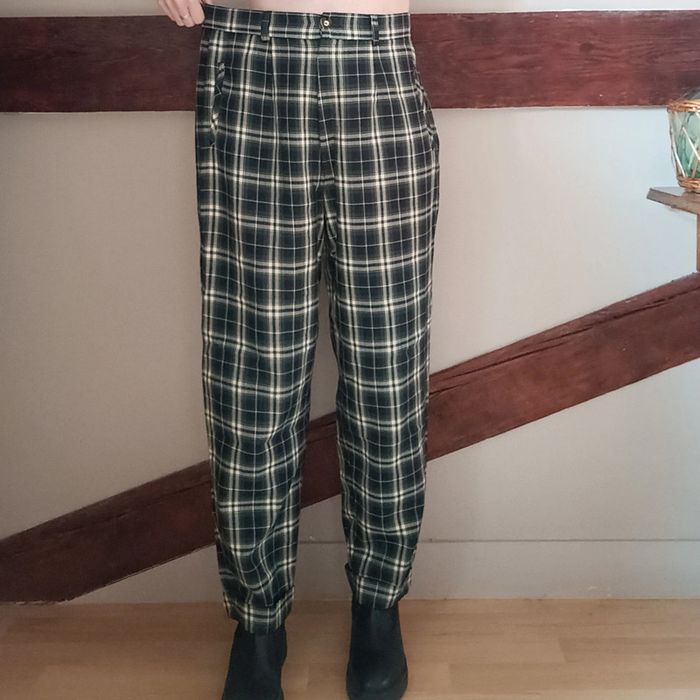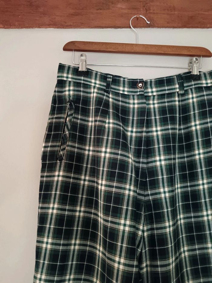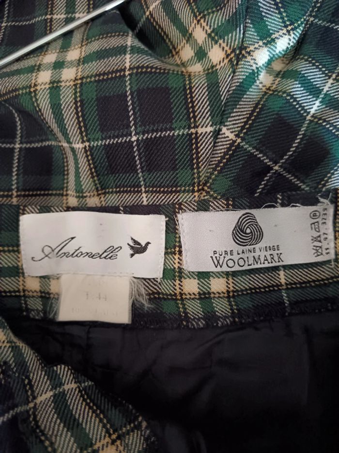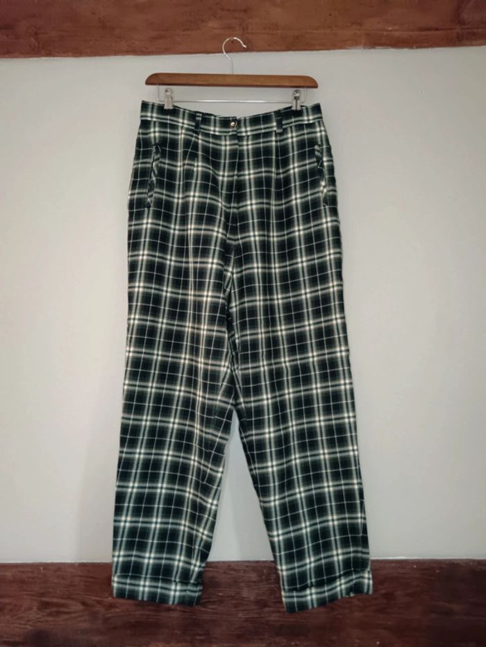 Pas d'envoi Vinted go, merci - ✨ Pantalon à pinces taille haute jambe large ressérée cheville à carreaux vert et crème, fausse poches Antonelle 100% pure laine vierge Woolmark années 80, doublé acétate jusqu'au genou Très bon état, à noter un petit reprisage au dessus de la poche droite, peu visible (dernière photo) Taille 44 sur étiquette mais conviendra plutôt à une taille 40 actuelle, je le porte sur un 36 sur les photos et mesure 1m61 📏 Dimensions à plat : largeur taille 38cm, fourche 34cm, hanches 55cm, longueur 96cm ❗ Étant une entreprise déclarée payant des charges, merci de respecter mon travail en ne le bradant pas 🙏 #desibellesfripes40