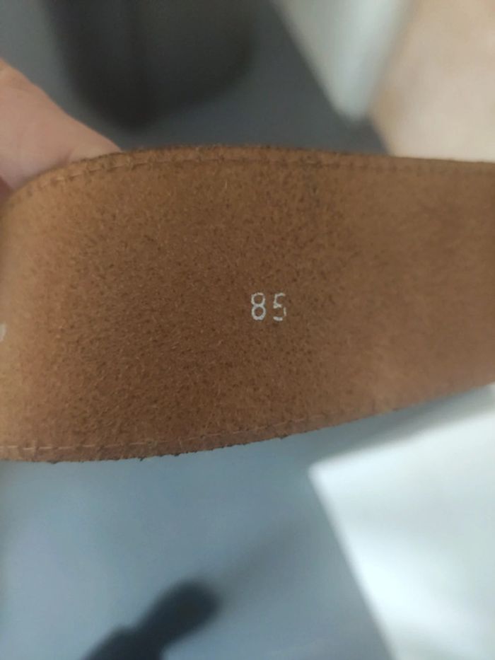 Ceinture arrondie pour plus de confort, en croute de cuir, très peu mise, en très bon état, une boucle à rafraîchir peut-être car elle est un peu ternie Taille 85, largeur 4,8 cm. Joli bleu