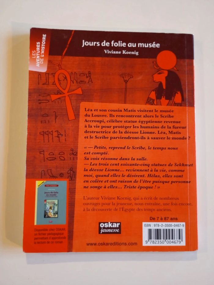 Léa et Matis visitent le musée du Louvre. Ils rencontrent alors le Scribe Accroupi, célèbre statue égyptienne revenue à la vie pour protéger les humains de la fureur destructrice de la déesse Lionne. Léa, Matis et le Scribe parviendront-ils à sauver le monde ? Éditeur : Oskar 104 pages Dimensions : 14,5 x 19 cm Âge : 8 - 10 ans Livre en bon état Je vends d'autres livres sur l'Égypte #phil_peg_égypte #nil #musée #vivianekoenig