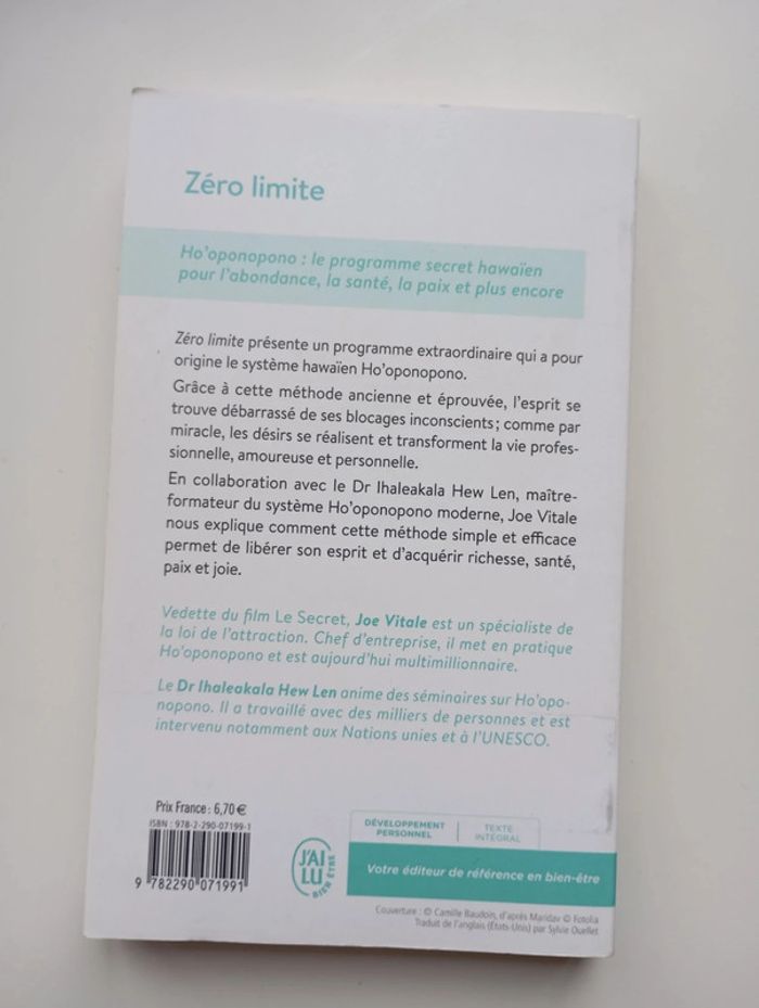 Zéro limite présente un programme extraordinaire qui a pour origine le système hawaïen Ho'oponopono. Grâce à cette méthode ancienne et éprouvée, l'esprit se trouve débarrassé de ses blocages inconscients ; comme par miracle, les désirs se réalisent et transforment la vie professionnelle, amoureuse et personnelle. En collaboration avec le Dr Ihaleakala Hew Len, maître formateur du système Ho'oponopono moderne, Joe Vitale nous explique comment cette formule simple et efficace permet de libérer son esprit et d'acquérir richesse, santé, paix et joie. 288 pages Dimensions : 11 x 18 cm Livre en excellent état #hawai #hooponopono