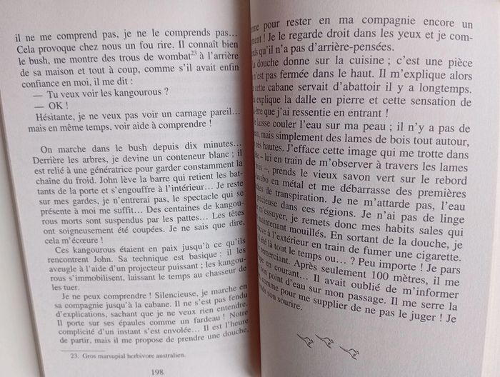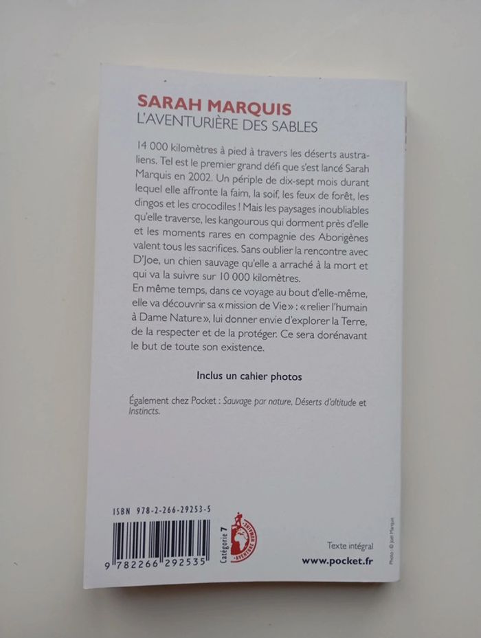 14 000 kilomètres à pied à travers les déserts australiens. Tel est le premier grand défi que s'est lancé Sarah Marquis, en 2002. Un périple de dix-sept mois lors duquel elle affronte la faim, la soif, les feux de forêt, les dingos et les crocodiles ! Mais les paysages inoubliables qu'elle traverse, les kangourous qui dorment près d'elle et les moments rares en compagnie des Aborigènes valent tous les sacrifices. Sans oublier la rencontre avec D'Joe, un chien sauvage qu'elle a arraché à la mort et qui va la suivre sur 10 000 kilomètres. En même temps, dans ce voyage au bout d'elle-même, elle va découvrir sa " mission de vie " : " relier l'être humain à Dame Nature ", lui donner envie d'explorer la Terre, de la respecter et de la protéger. Ce sera dorénavant le but de toute son existence. Inclus un cahier photos Éditeur : Pocket 264 pages Dimensions : 11 x 18 cm Livre en parfait état Je vends un autre livre de Sarah Marquis #phil_peg_sarahmarquis #australie #aventure #experienceinitiatique