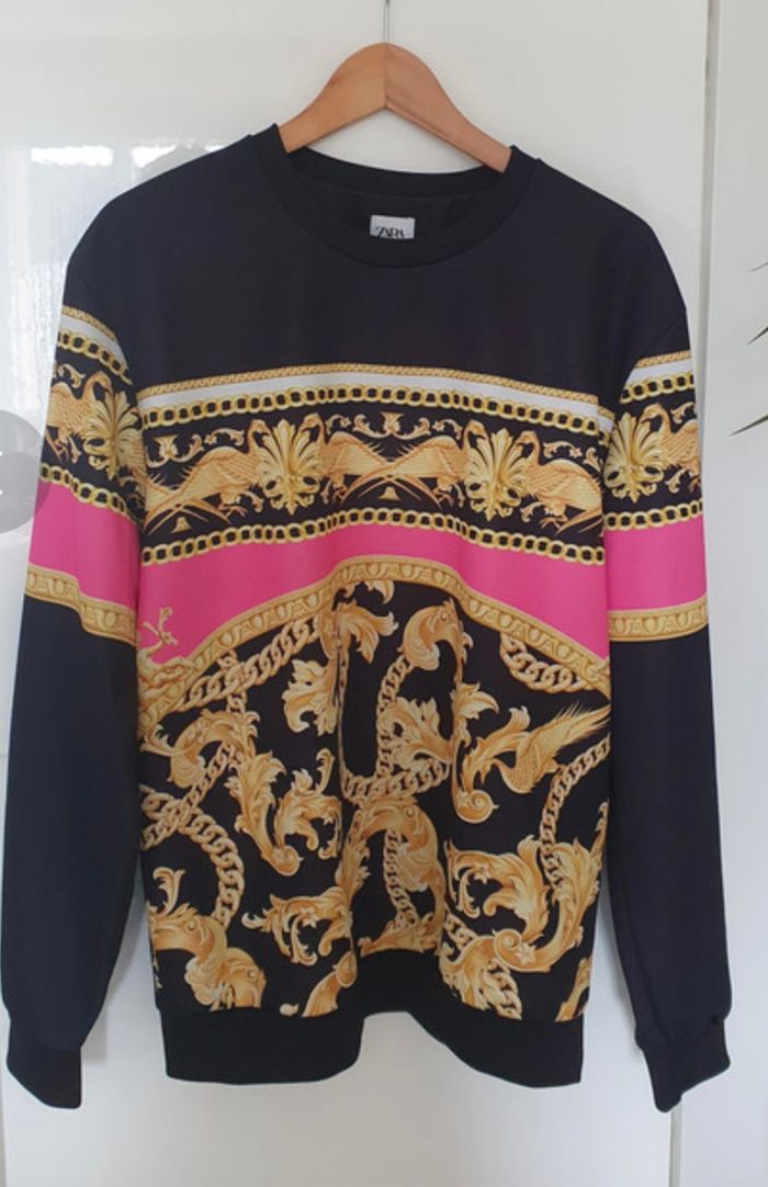 Sweat noir, rose et "or". Manches longues. Col rond. Marque Zara. Taille XL. En Excellent état. Acheté 30€.