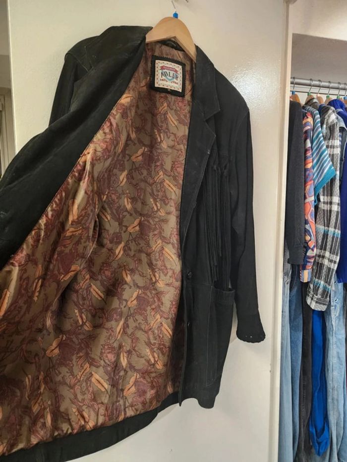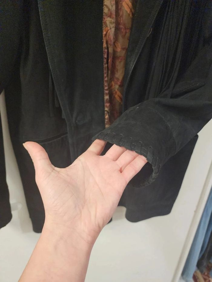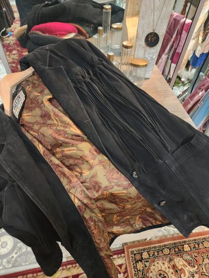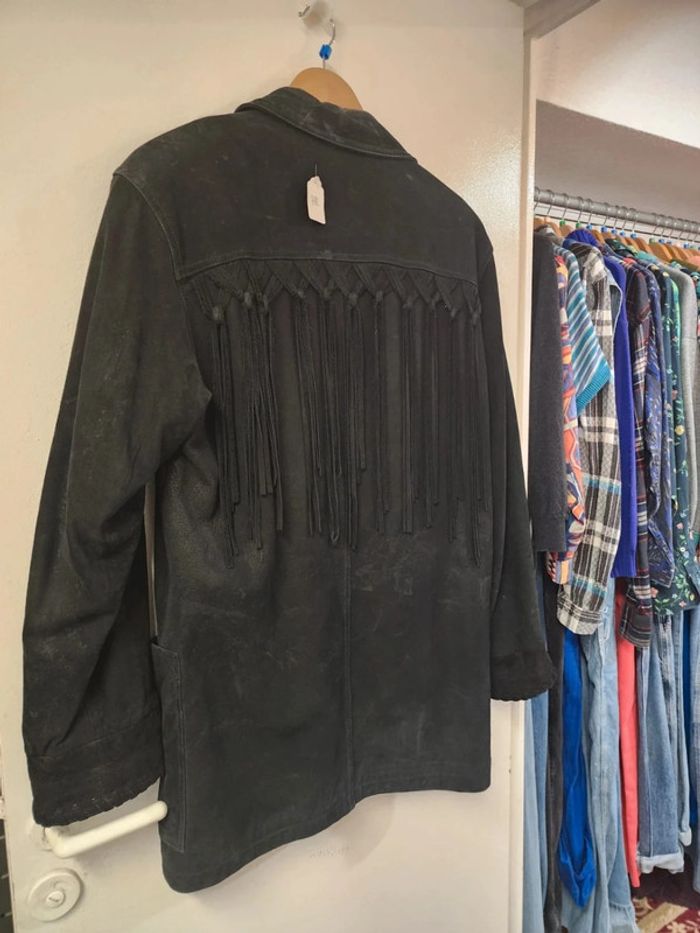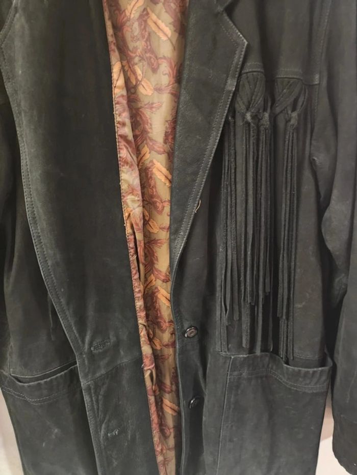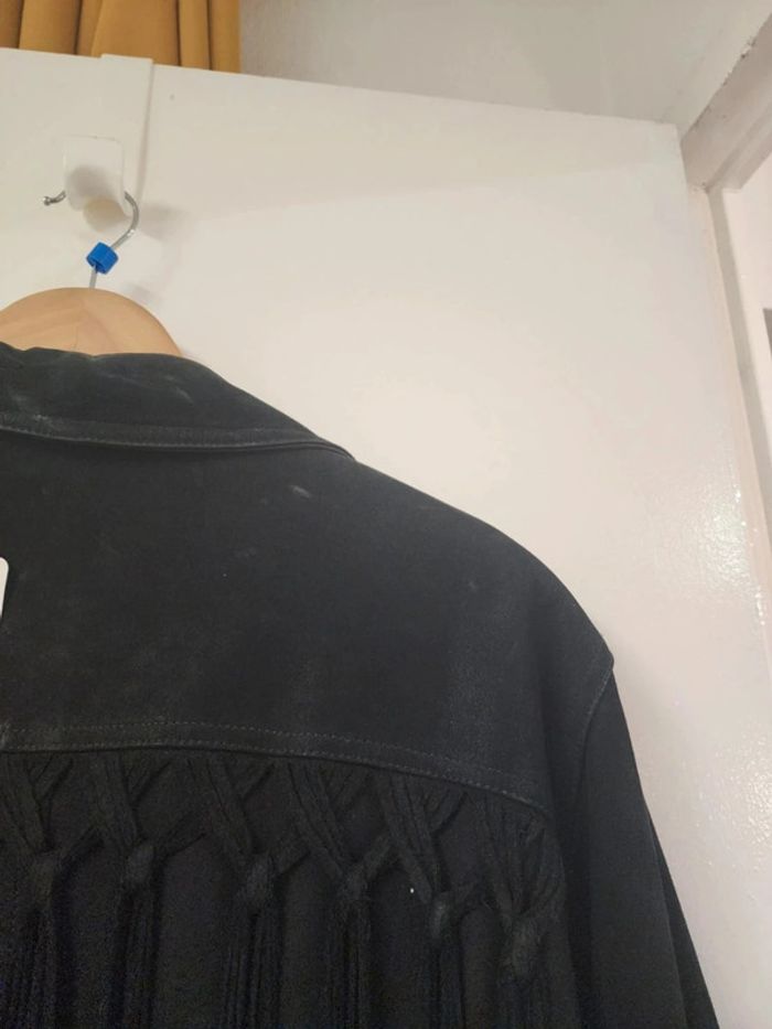 🌼 Remise sur les lots 🌼 -5% pour 2 articles -10% pour 3 articles -15% pour 4 articles -20% pour 5 articles et + www.instagram.com/kozhaevintage 🫶 Jolie veste noire en cuir daim, doublure adorable, a franges style western. Taille M homme, jusqu'aux 42 femme