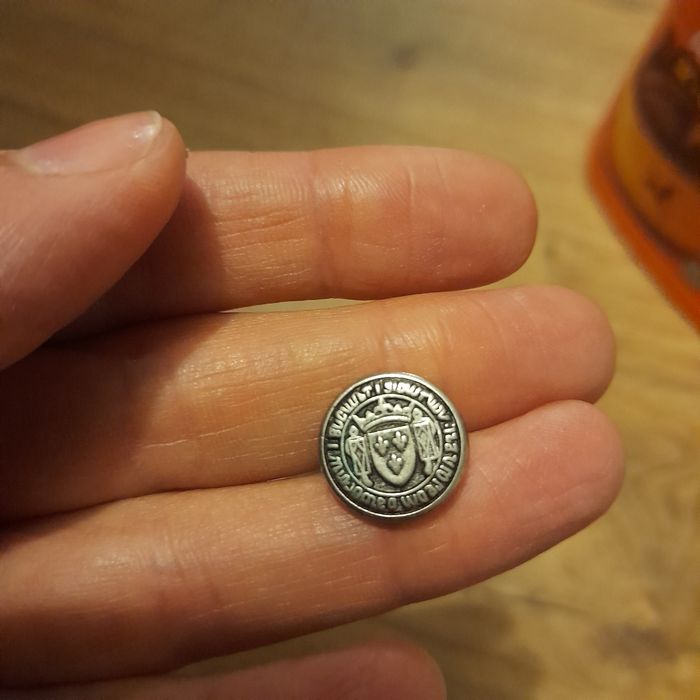 Bouton vintage argenté blason fleur de lys et couronne, un chevalier en armure de chaque côté et inscription autour.