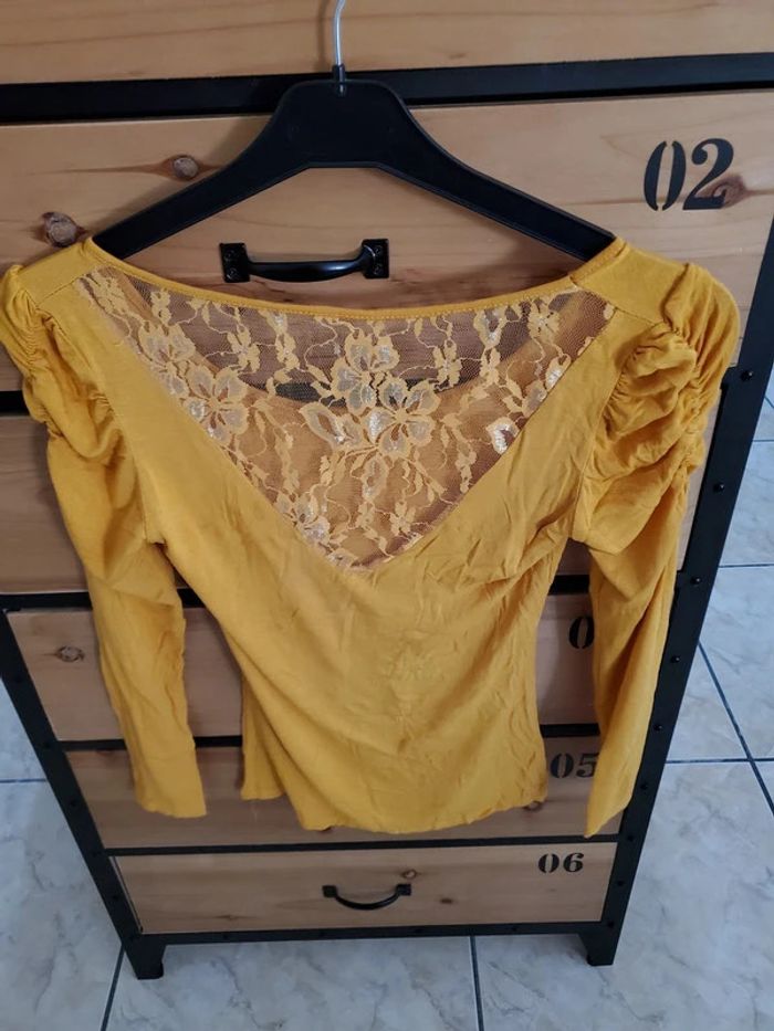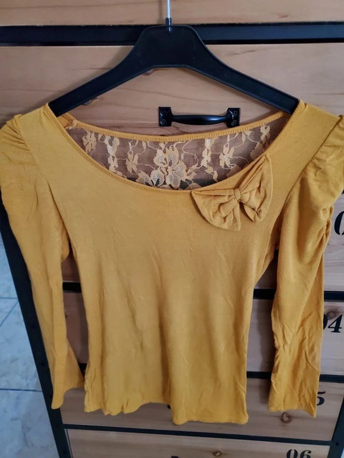 Joli haut Tee-shirt manches longues couleur moutarde Taille 36 En très bon état Avec dentelle au dos et petit nœud devant #sabrina668336