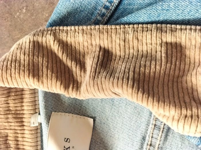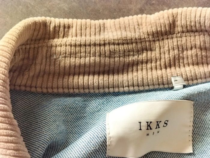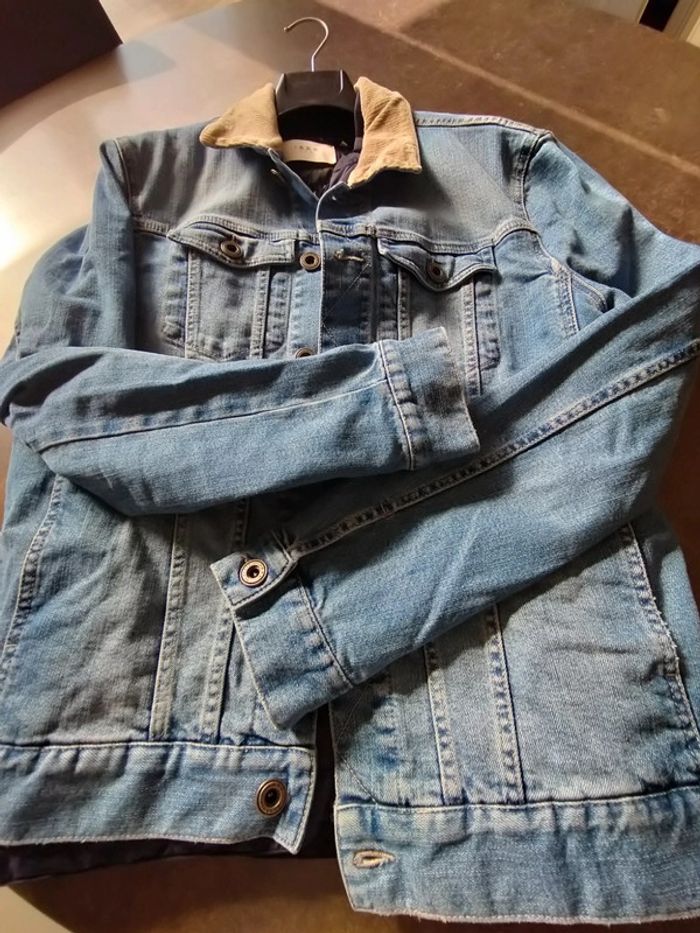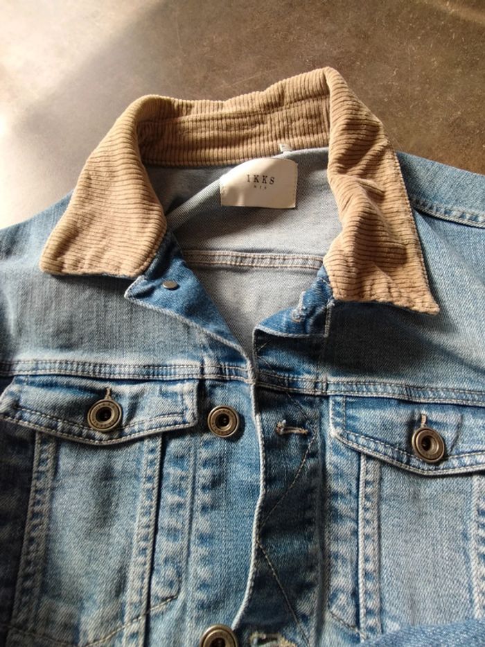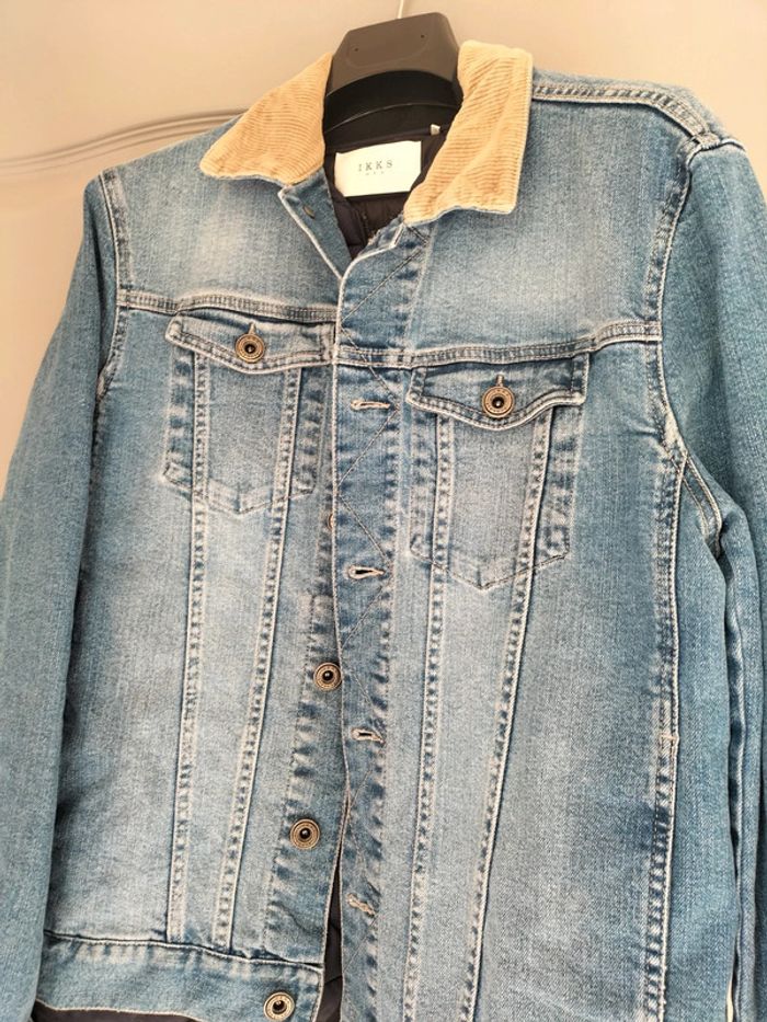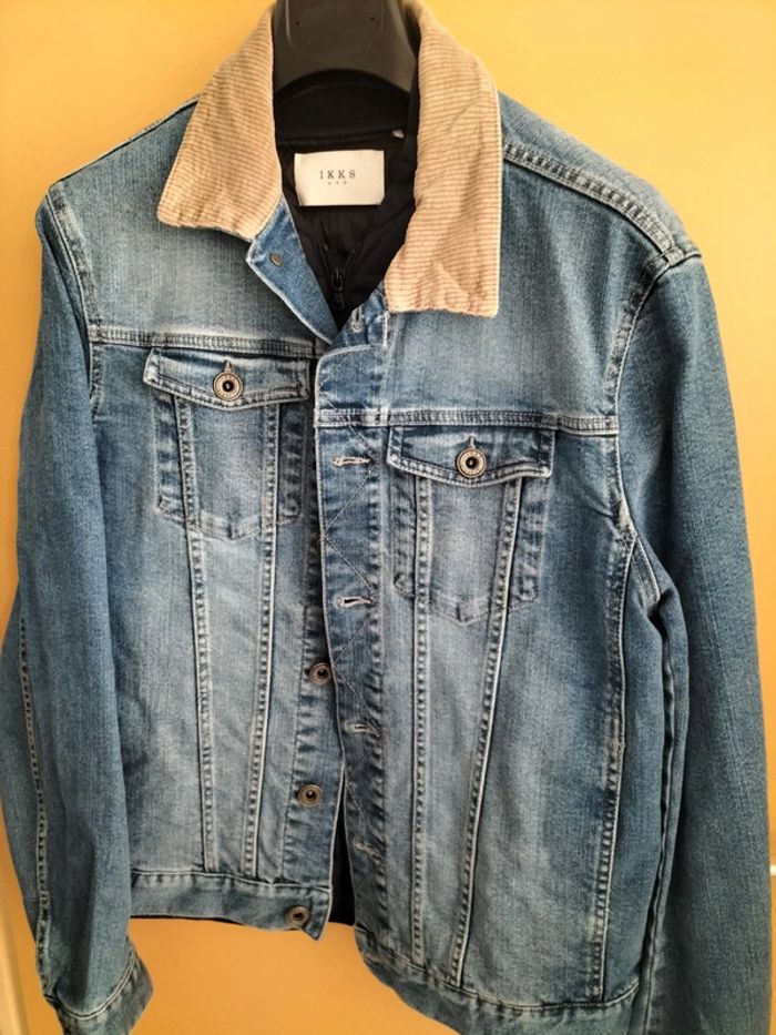 Veste en jean bleu taille L Col en velours côtelé beige/ camel Boutons Poches latérales et intérieures Très bon état sauf repris au niveau du col 5 cm intérieur la réparation se voit en revanche en porté ne se voit pas, voir sur photos. Dimensions aisselles à aisselles 54 cm Longueur totale 65 cm Longueur manche 65 cm Il n'a plus son étiquette composition. Ikks