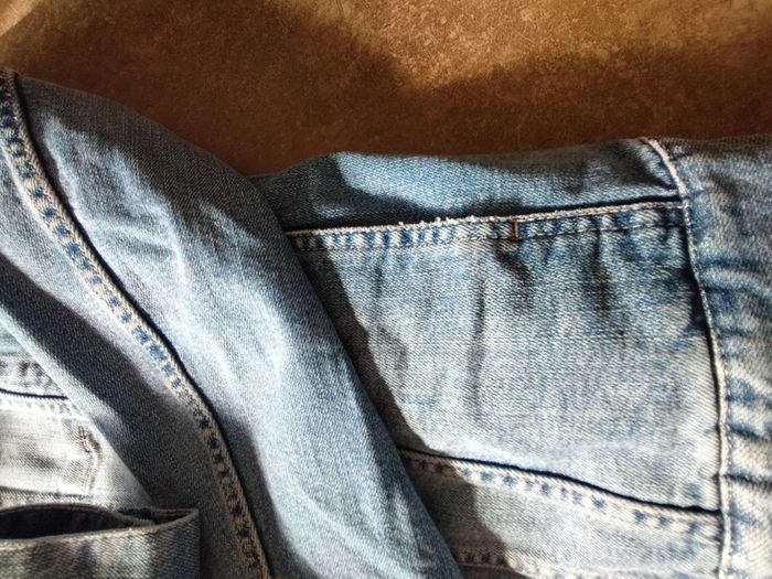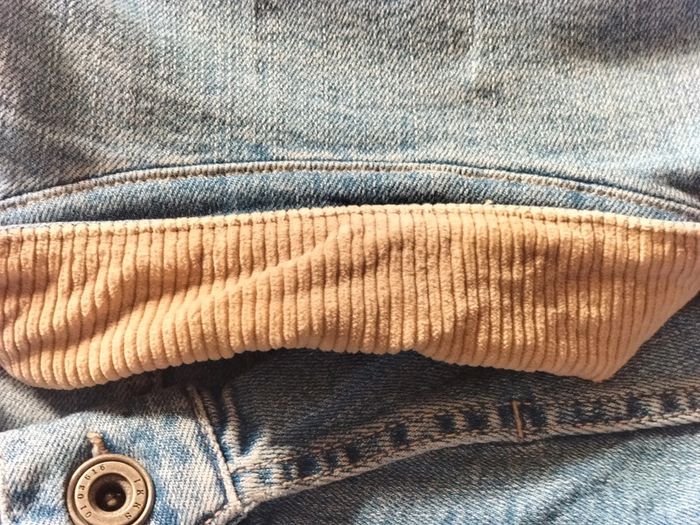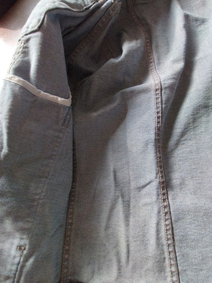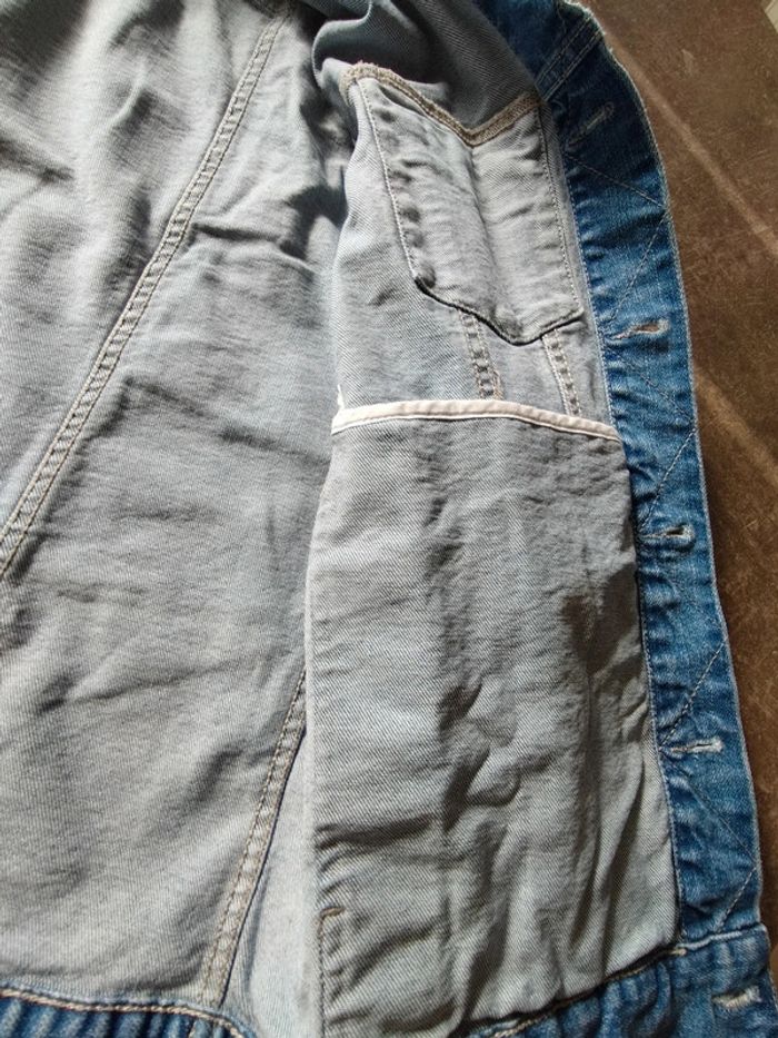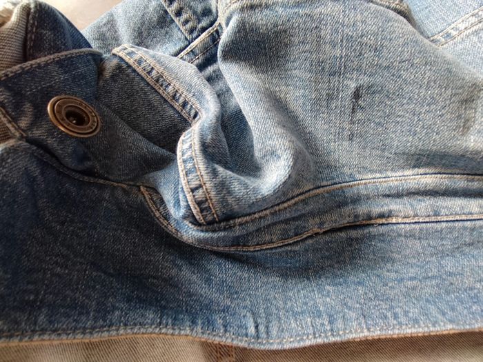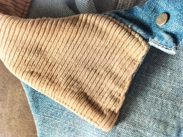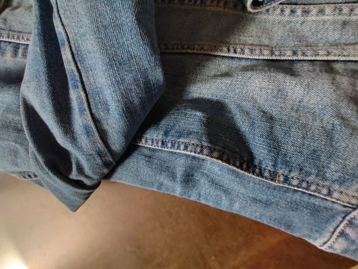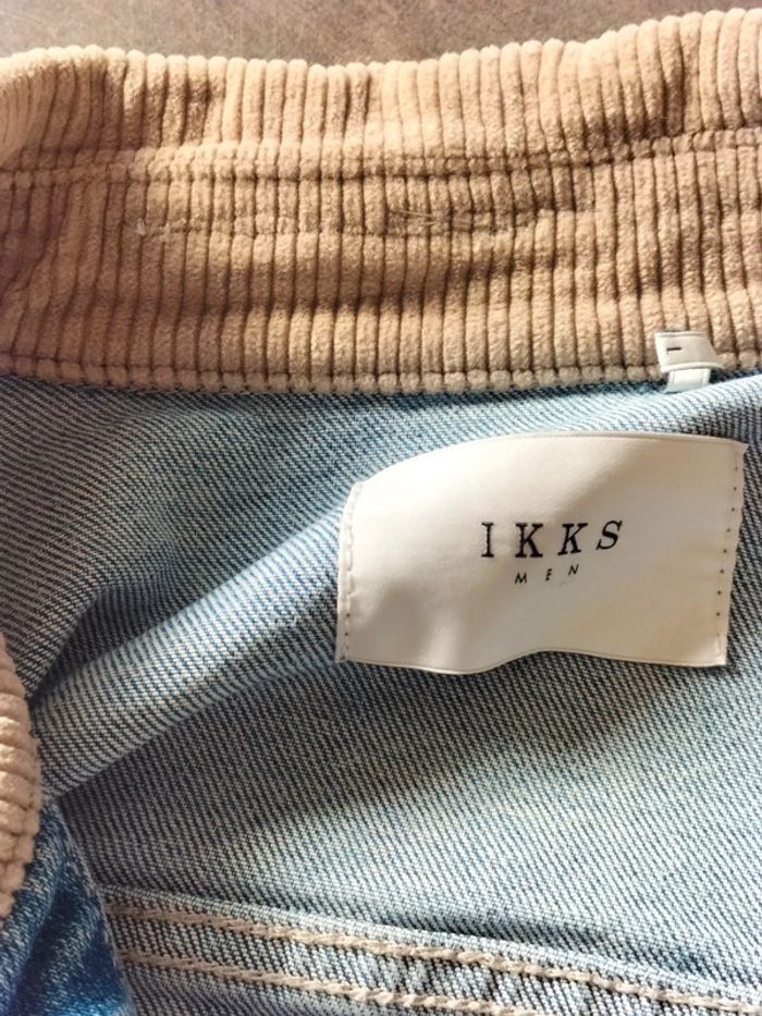 Veste en jean bleu taille L Col en velours côtelé beige/ camel Boutons Poches latérales et intérieures Très bon état sauf repris au niveau du col 5 cm intérieur la réparation se voit en revanche en porté ne se voit pas, voir sur photos. Dimensions aisselles à aisselles 54 cm Longueur totale 65 cm Longueur manche 65 cm Il n'a plus son étiquette composition. Ikks