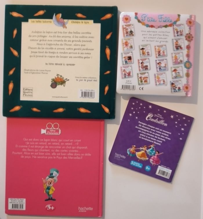 Lot de 4 livres pour enfants - Cendrillon Mon Histoire du soir "Disney" - Alice au pays des Merveilles "Disney" - Lilou joue à la poupée "Fleurus" - La Fête des Carottes (un livre velouté) "Éditions Quatre Fleuves"