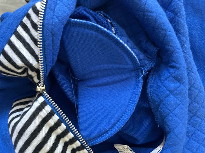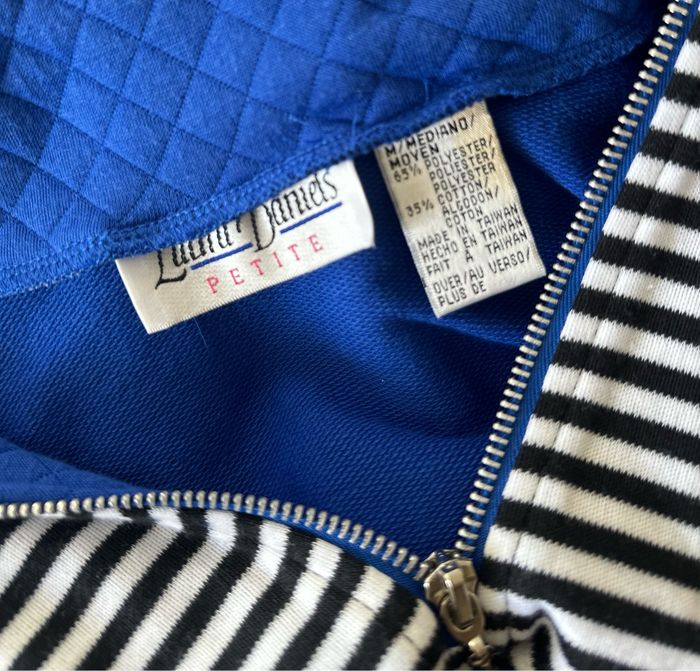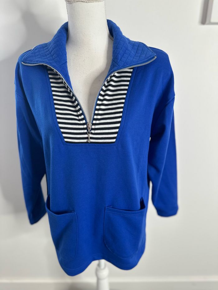 Sweatshirt - Excellent état - Taille 38 équivalent M Dimensions en bas de l’annonce - Laura Daniel’s - Vintage années 80’ - Col camionneur, zip, col cheminée - Épaulettes (possibilité de les couper) - Deux poches à l’avant - Bleu électrique, bleu roi, bleu majorelle - Marinière, à rayures - Intérieur effet éponge - Polyester et coton Dimensions: - 55cm niveau aisselles - 63cm de long