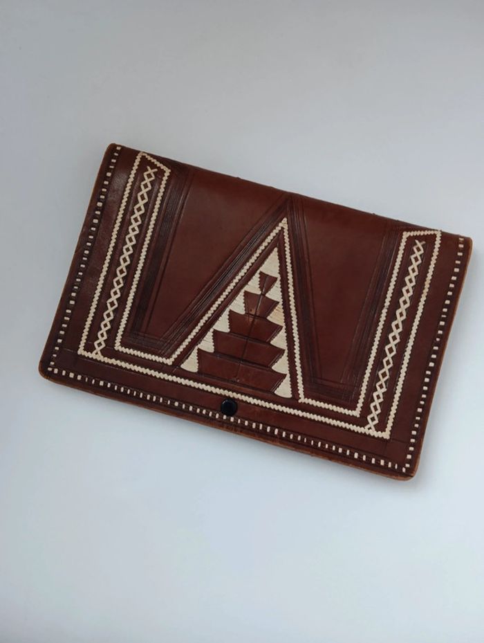 Petite pochette vintage en cuir marron dessins blancs - photo numéro 2