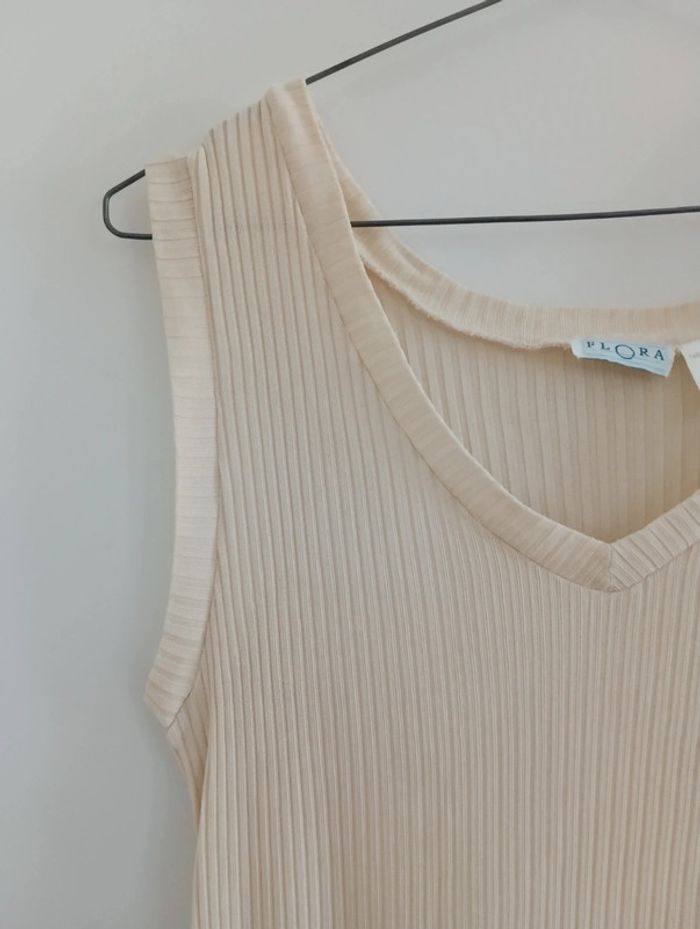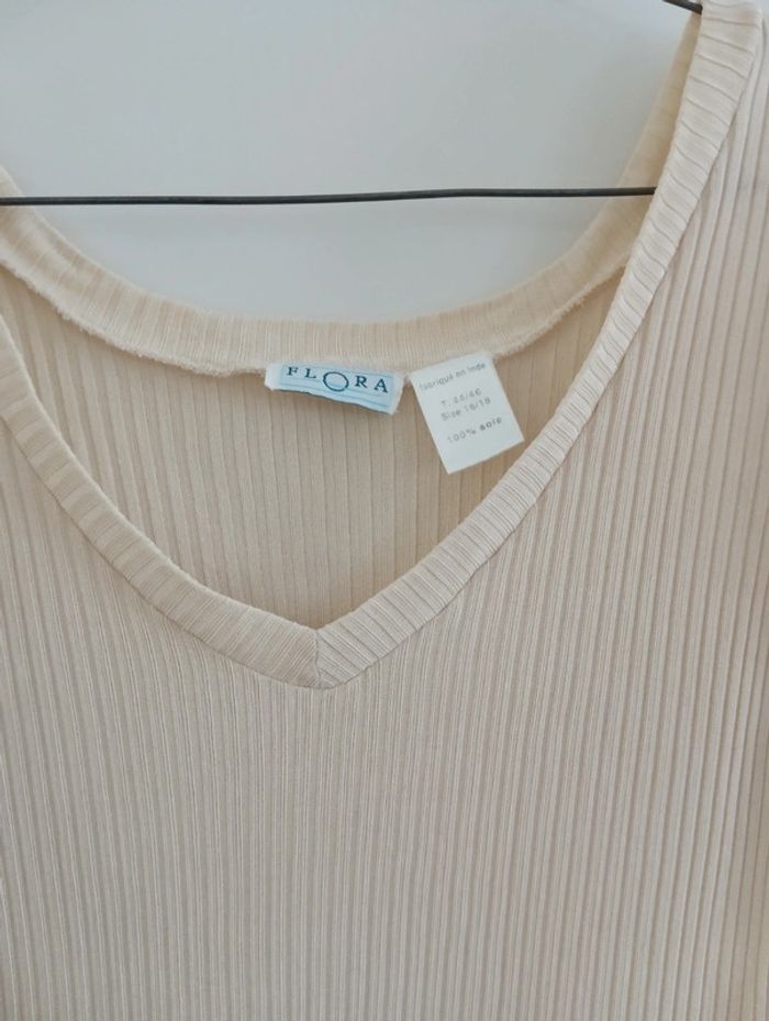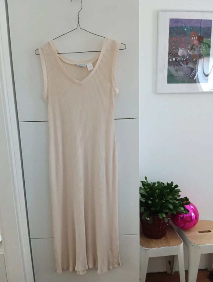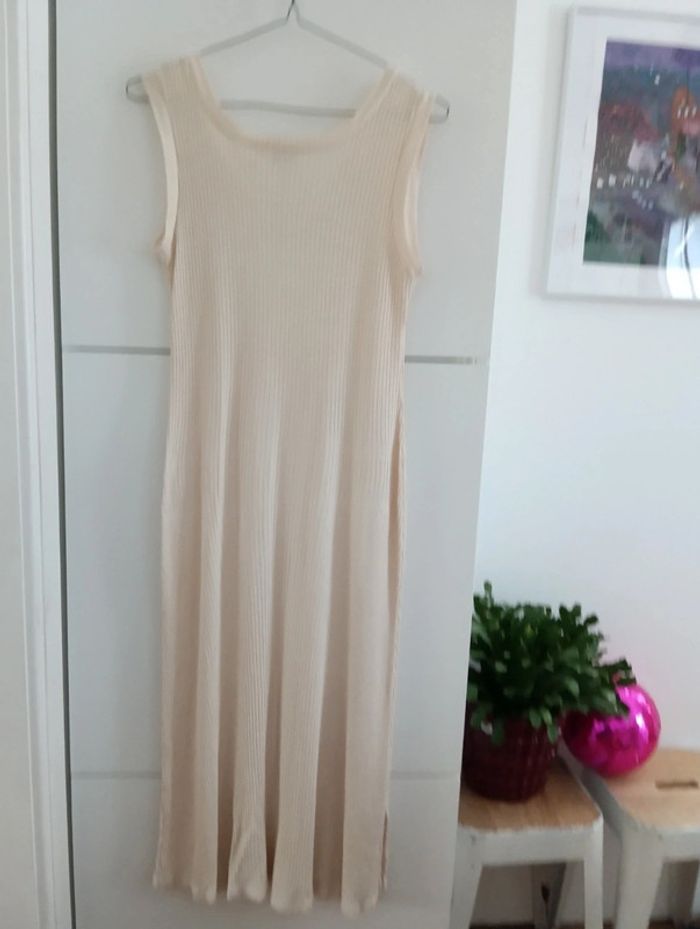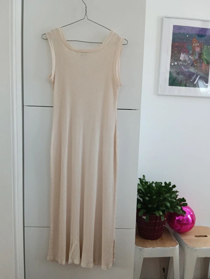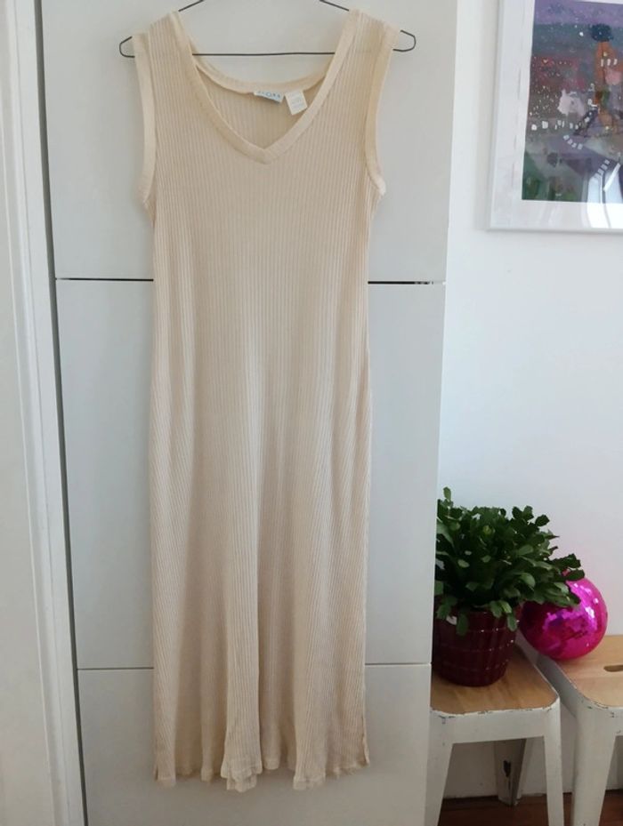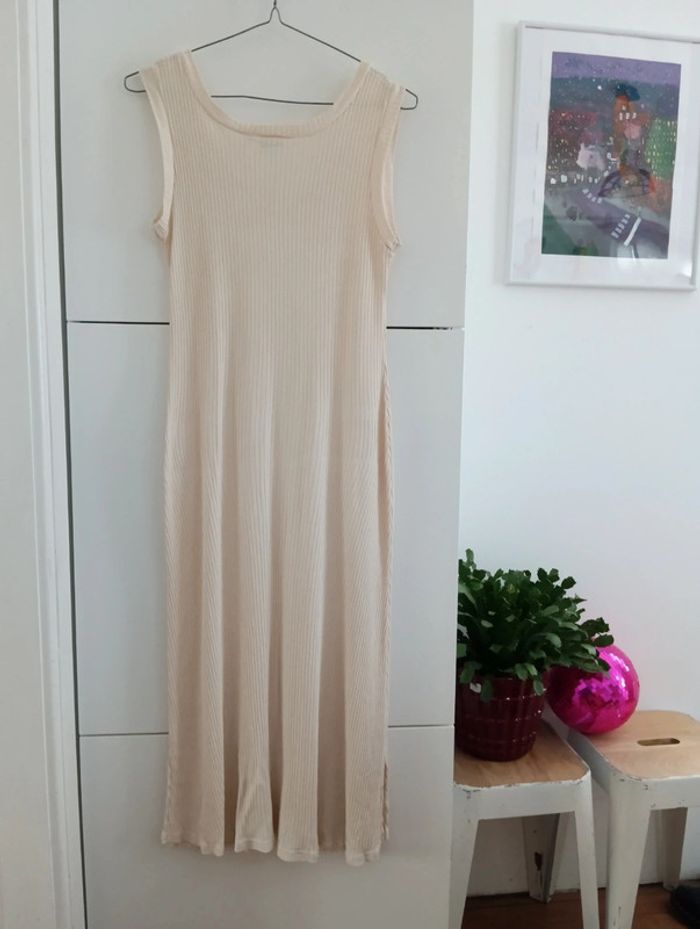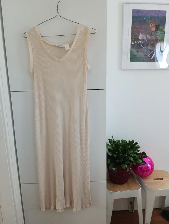 Robe longue vintage côtelée En soie, écrue transparente Flora fabriquée en Inde Taille 40 estimée à confirmer avec les mesures Matière extensible Mesures Epaules 40cm Aisselles 48cm Longueur 123cm