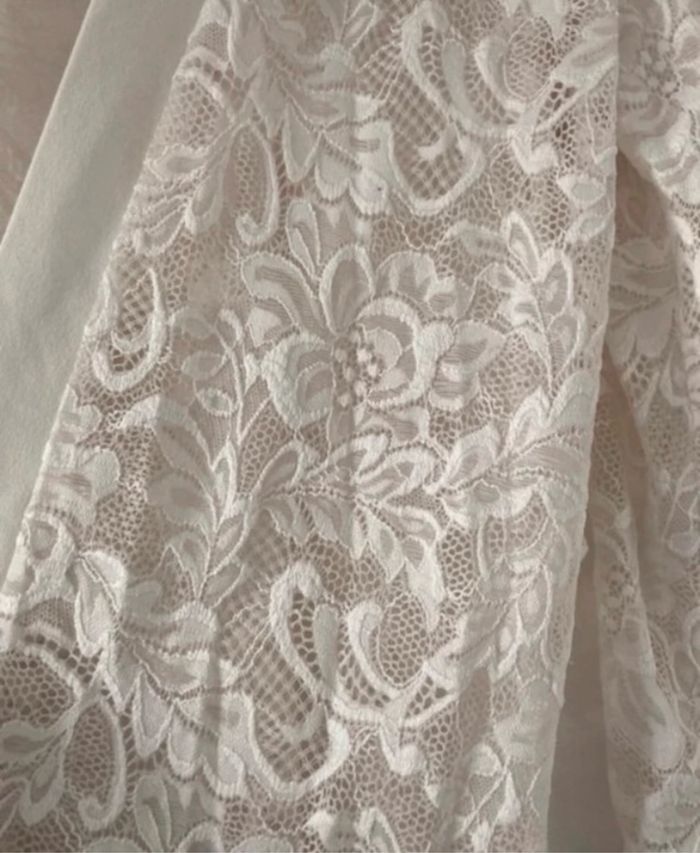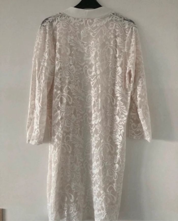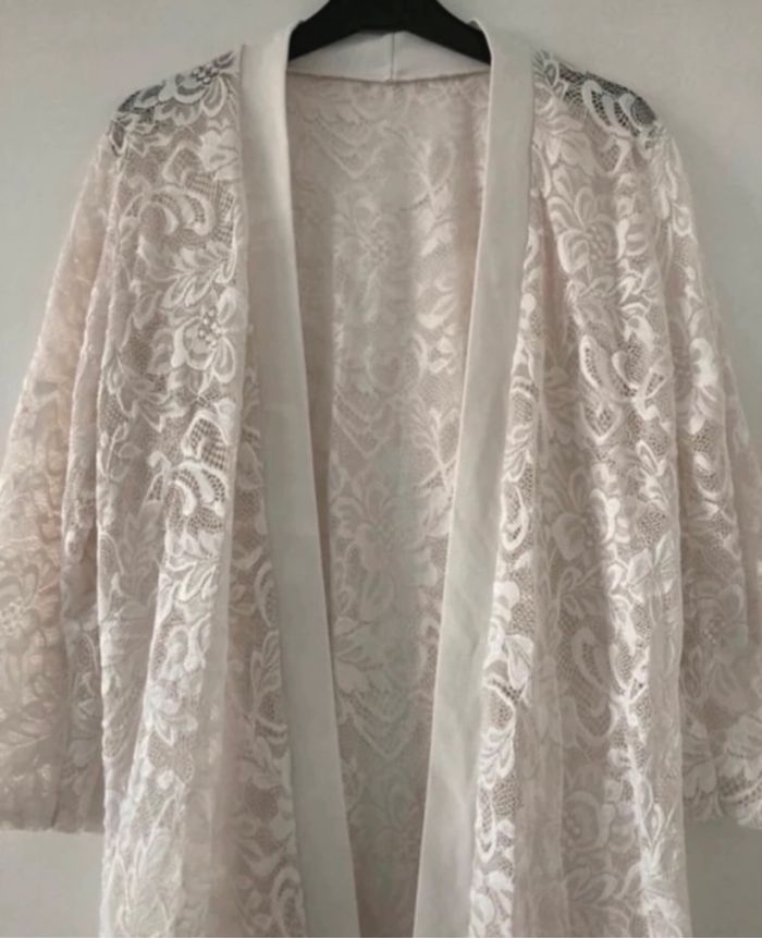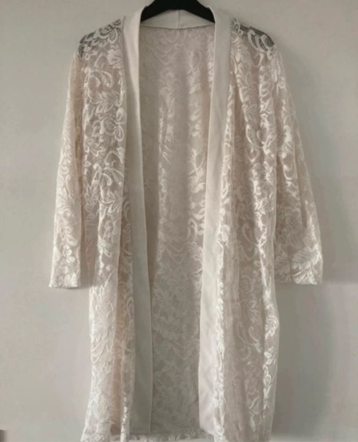 Veste kimono couleur blanc cassé crème clair. Motif broderie fleurs. Longueur 82cm. Manches 3/4, idéale mi saison. Taille unique, convient jusqu’à un 40.