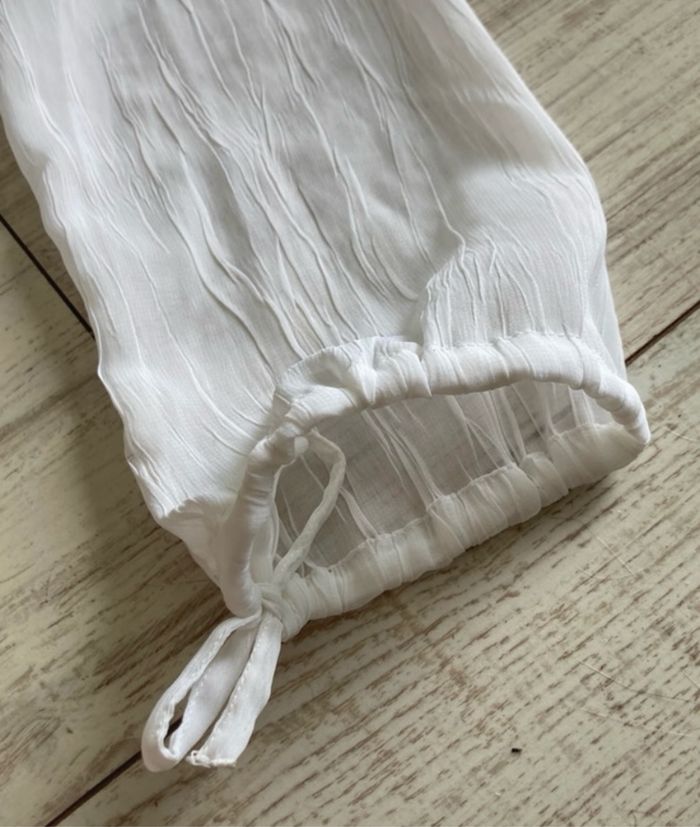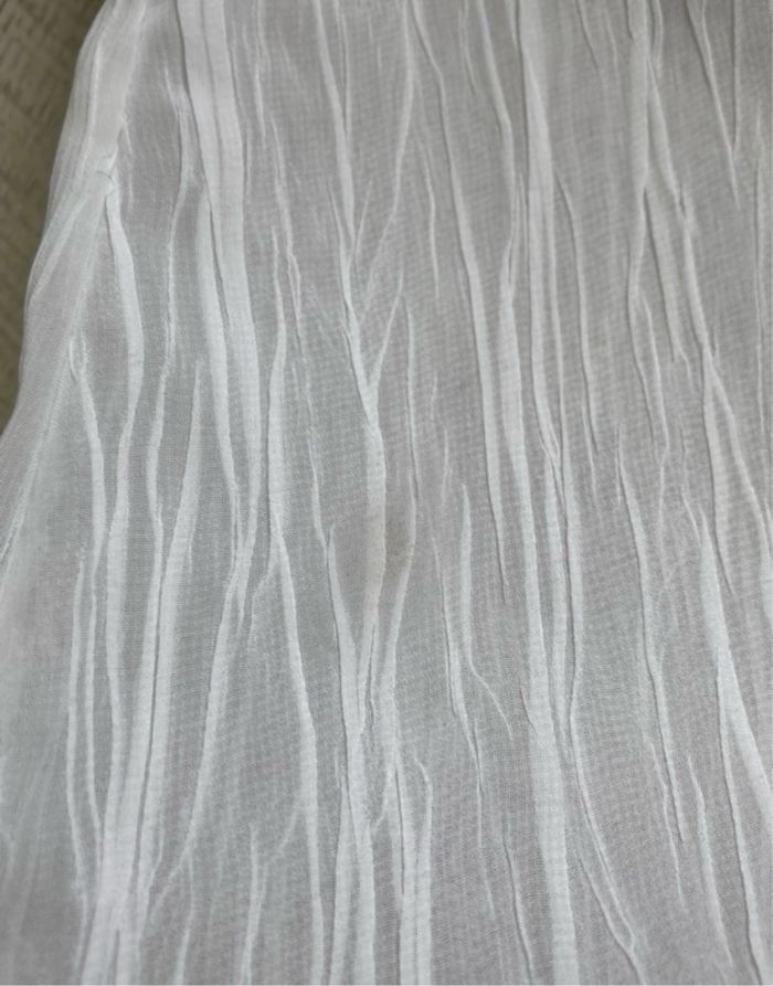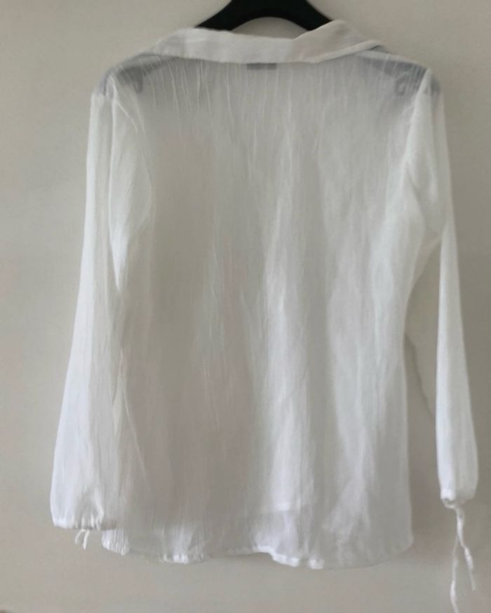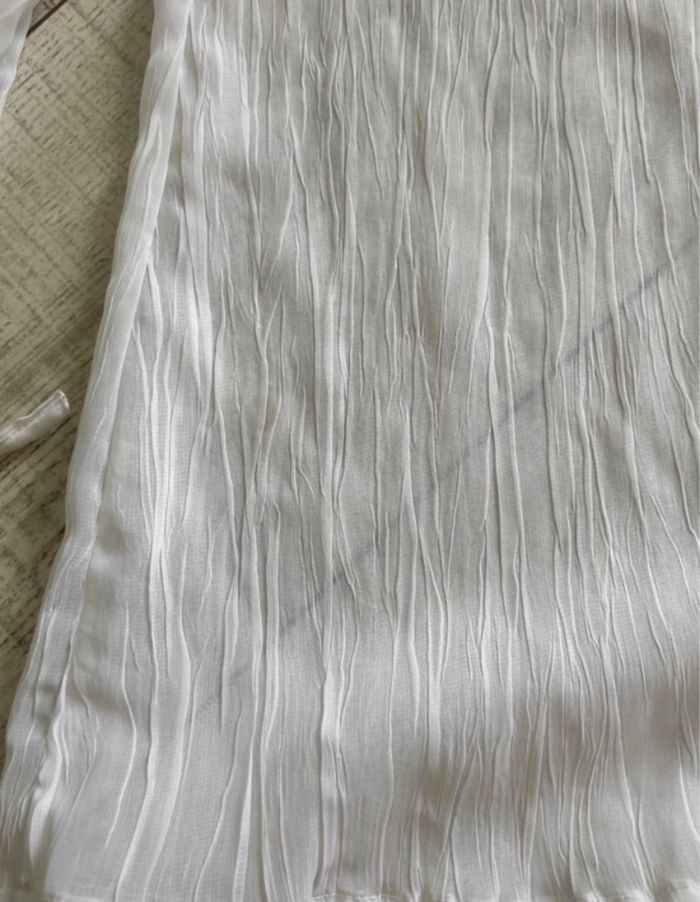 Blouse tunique ou chemisier manches longues blanc effet froissé. Une micro tache (à peine visible sur les 2 photos) Il n’y a plus d’étiquette pour la taille et la matière (viscose ou polyester).