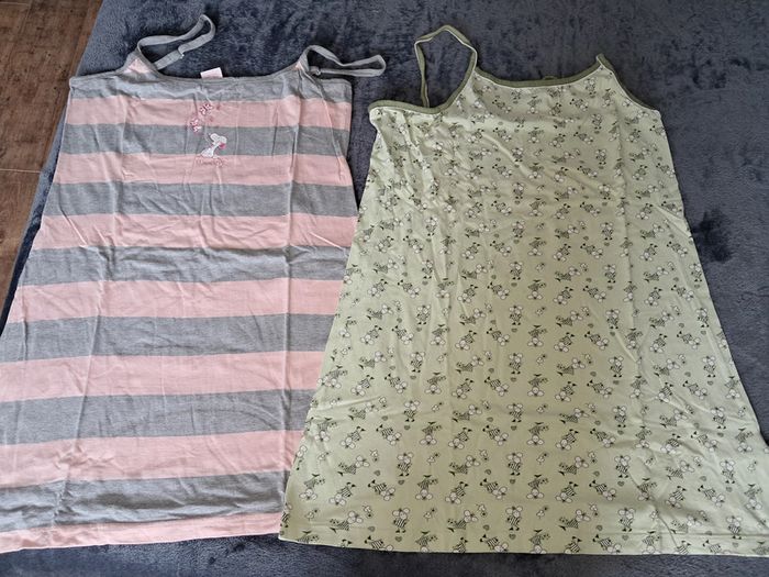 lot de 2 chemises de nuit fines bretelles (celles de la rayée sont réglables), les 2 en coton et en 46, marque : rayée : Snoopy, la verte avec souris : Nuit Chinée, jamais portées