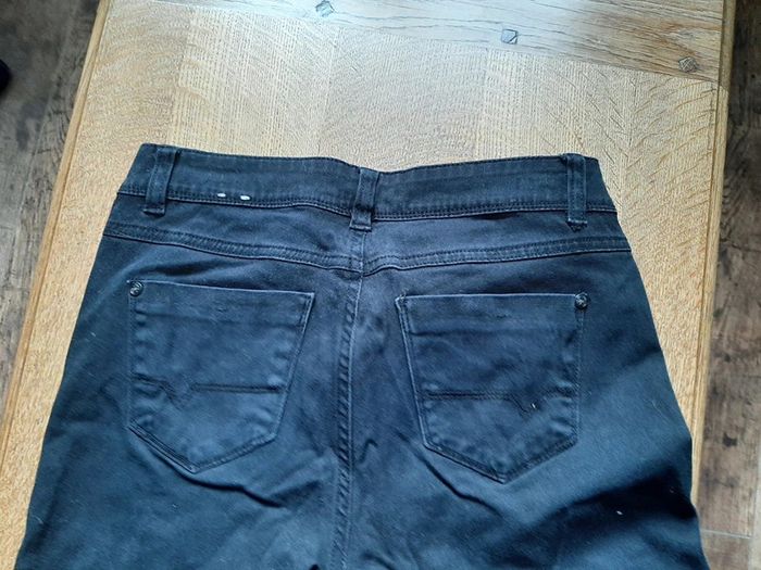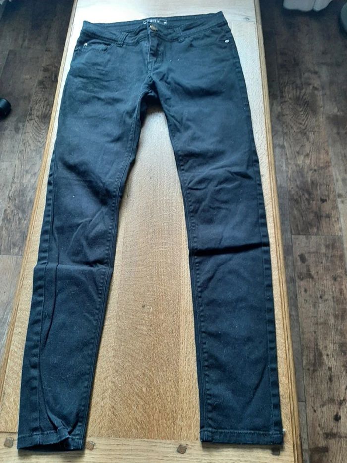 jean skinny noir, elastiss, fermeture éclair + bouton,2 poches bassin + 2 poches fesses, taille 38, marque Denim