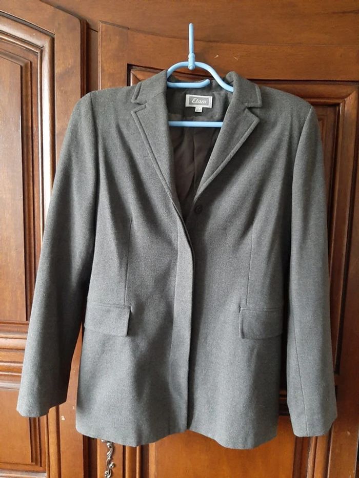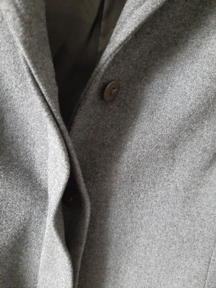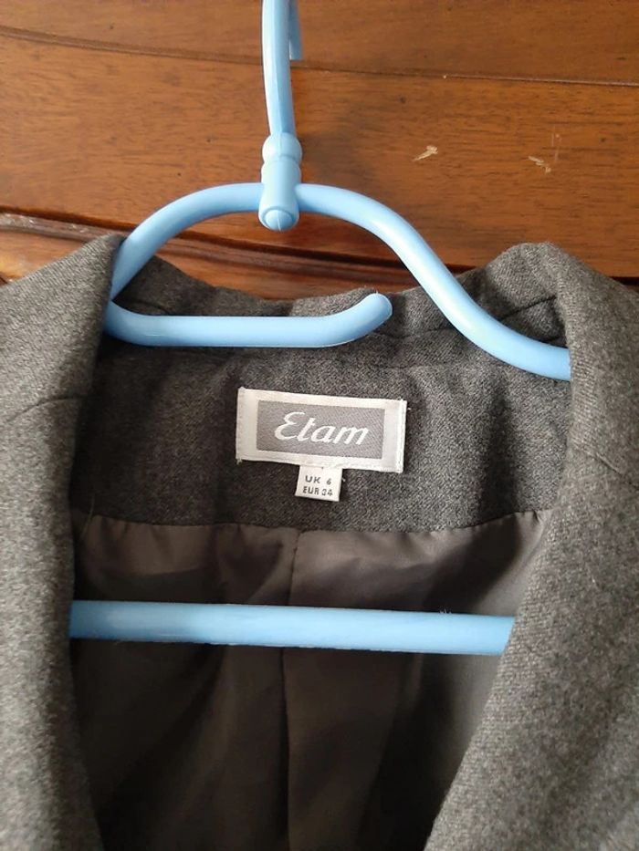 petite veste droite doublée, marque ETAM, grise, fermée par 4 boutons cachés par un revers, deux fausses poches, taille 34,