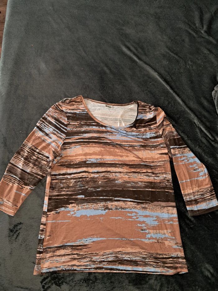 tee shirt manches longues, marron, beige, bleu, elastann et viscose, taille 46-48, marque Damart, jamais porté