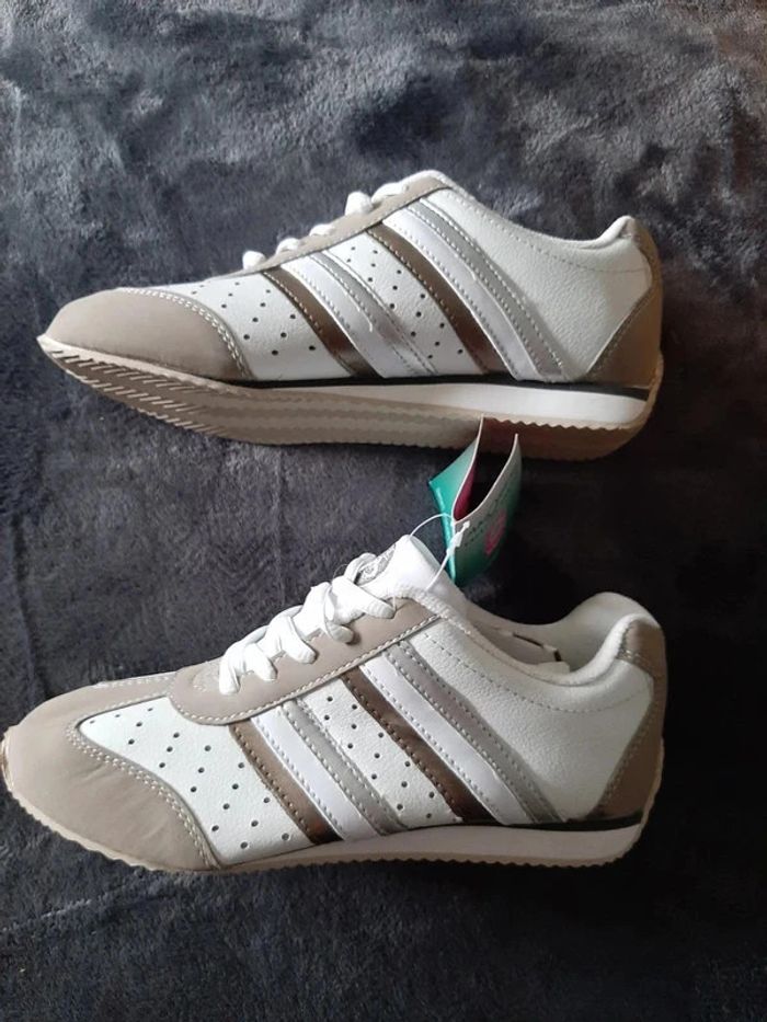 tennis Amortyl , absorbeur de choc au niveau du talon et de l'avant pied, semelle intérieure cuir, couleur blanc et taupe, taille 38, marque Damart, jamais portées