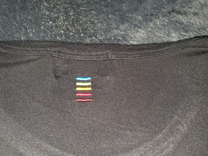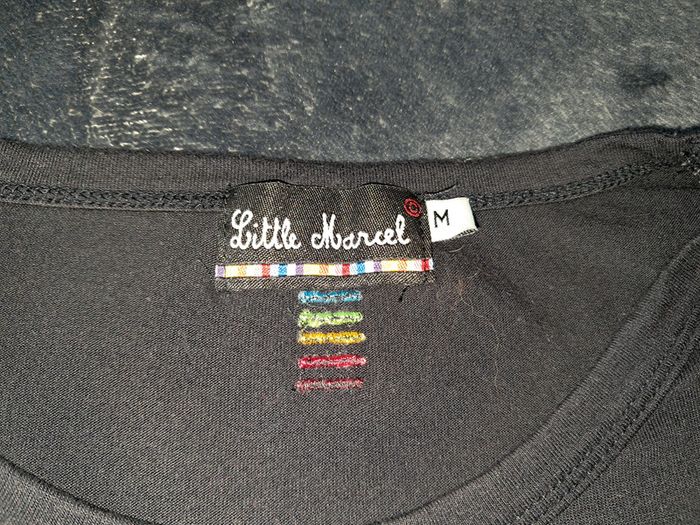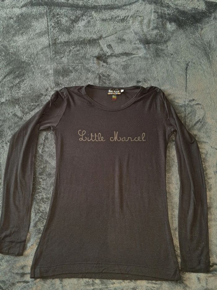 tee shirt fin fluide, manches longues, col rond, couleur noire, flockage sur le devant, broderie dans le dos, taille M, marque Little Marcel