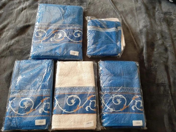 ensemble parure éponge 1 drap de bain bleu canard 70/130 + 3 serviettes 50/90 2 bleues 1 blanche + 6 gants 3 blancs 3 bleus avec passant pour accrocher, feston autour + borderie, 100% coton, marque Françoise Saget, neuf sous blister
