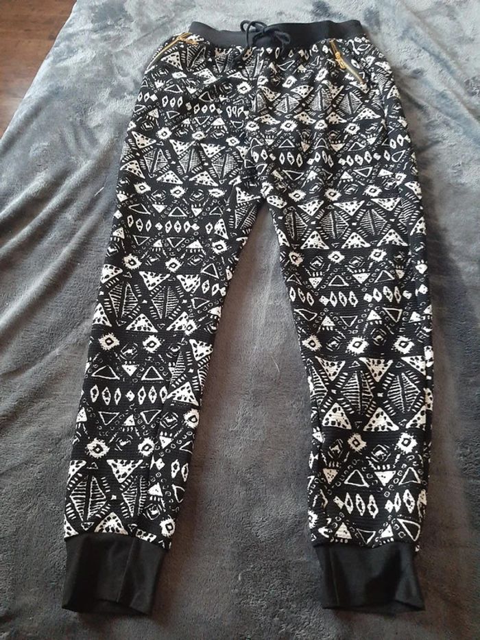 pantalon fluide, 85% polyamide, 15% elastan, très agréable à porter, resserré au bas, 2 poches avec zip en biais, taille elastiquée + cordon, couleur noir et blanc, pas de taille d'indiquée mais je dirais taille M,