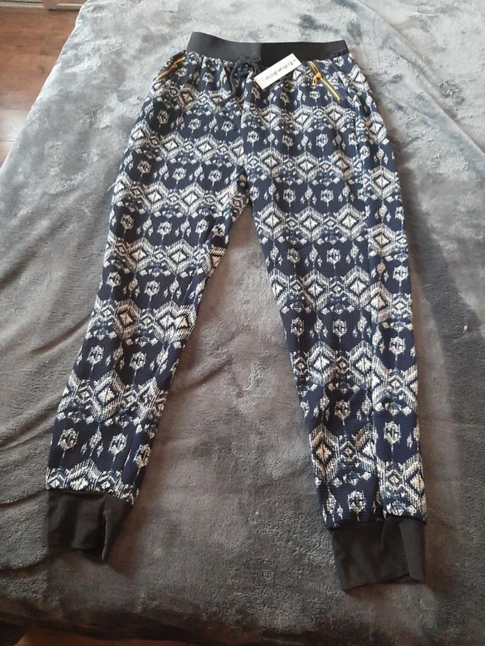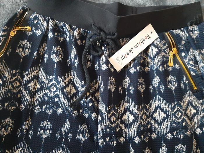 pantalon fluide elastan M / 38 / 10·Neuf avec étiquette 8,00 € pantalon fluide, 85% polyamide, 15% elastan, très agréable à porter, resserré au bas, 2 poches avec zip en biais, taille elastiquée + cordon, marine et blanc, pas de taille d'indiquée mais je dirais taille M,