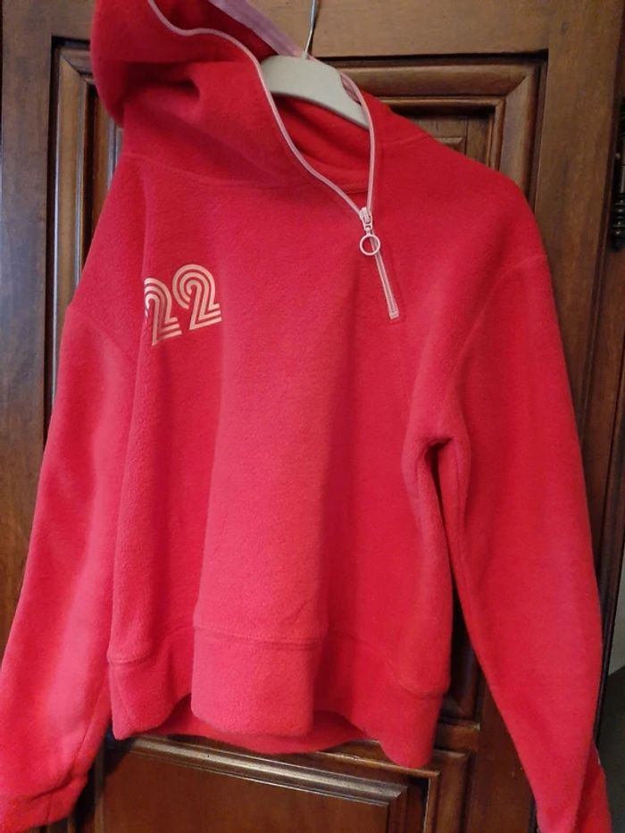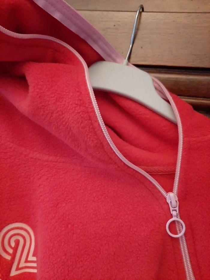 sympa petit sweat polaire à capuche avec zip tout le long, flockage dans le dos, fin liseret blanc sur les manches, couleur rouge, taille 34, marque M L 602 Sport