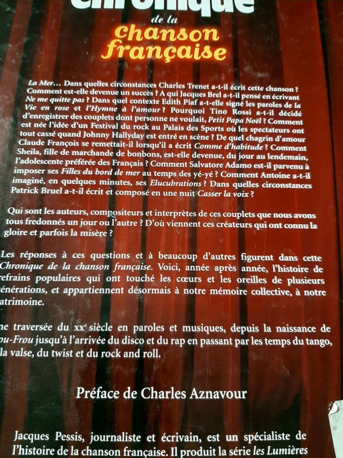 Superbe livre sur la chronique de la chanson française d'avant 1900 à 2003, écrit par Jacques Plessis, journaliste et écrivain spécials de l'histoire de la chanson française, comment ont été écrites certaines chansons, dans quel contexte... préface de Charles Aznavour, 240 pages, nombreuses photos, couverture cartonnée,