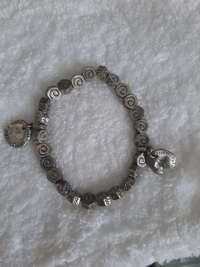 bracelet métal argenté, monté sur elastique, chaque perle est frappée dessus-dessous et les cotés