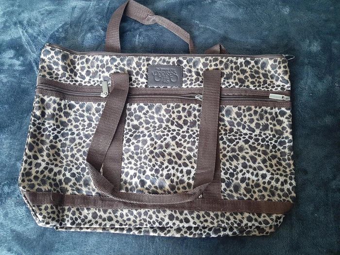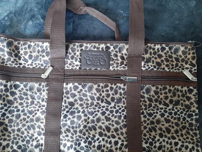 superbe sac à anses le temps des cerises, imprimé léopard, trois poches avec fermeture éclair sur le devant et une à l'intérieur, entièrement doublé dimensions : 46x30cm, épaisseur 10cm