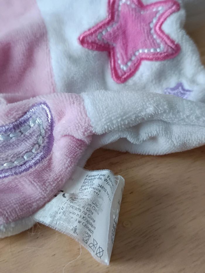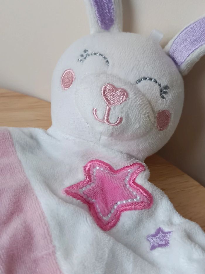 Doudou lapin dormeur blanc, rose et violet avec étoiles et lune Marque Leclerc Étiquette usée Expédié sous 24h 📦