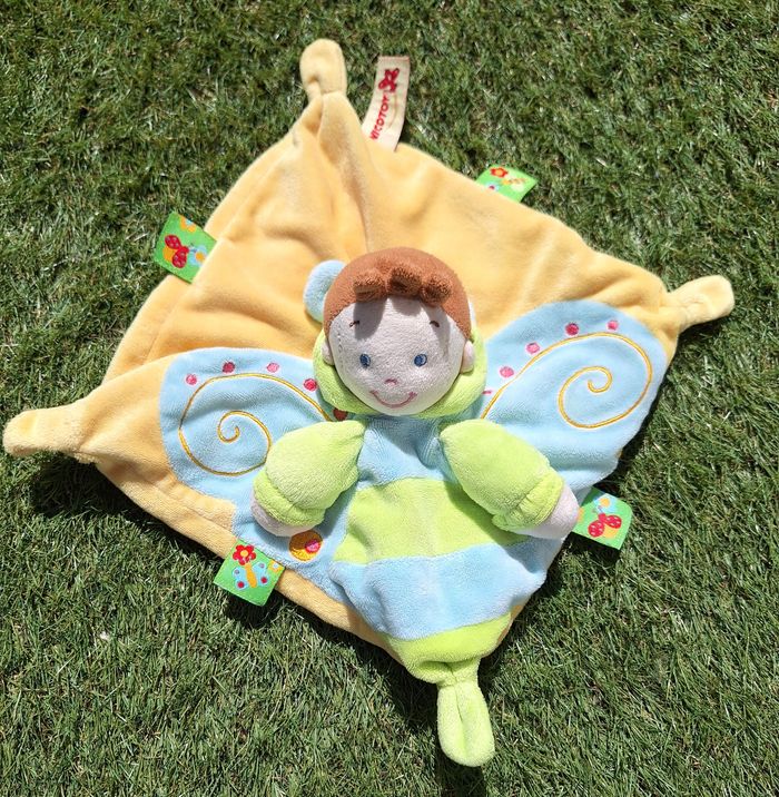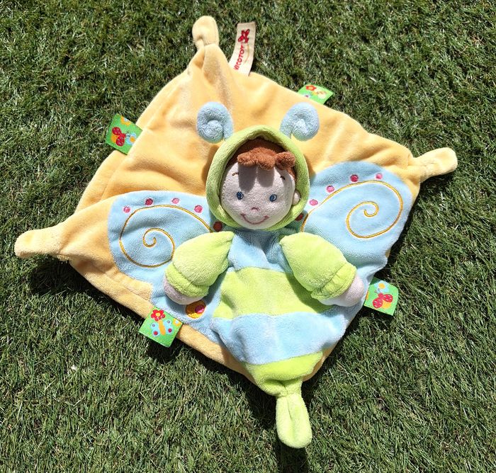 DOUDOU CARRE PLAT EN VELOURS DE COULEUR JAUNE, BLEU ET VERT TETE GARCON AU MILIEU DU DOUDOU CAPUCHE PAPILLON VERT AVEC ANTENNES BLEUES AILES PAPILLON BRODEES SUR LE DOUDOU ETAT NEUF !