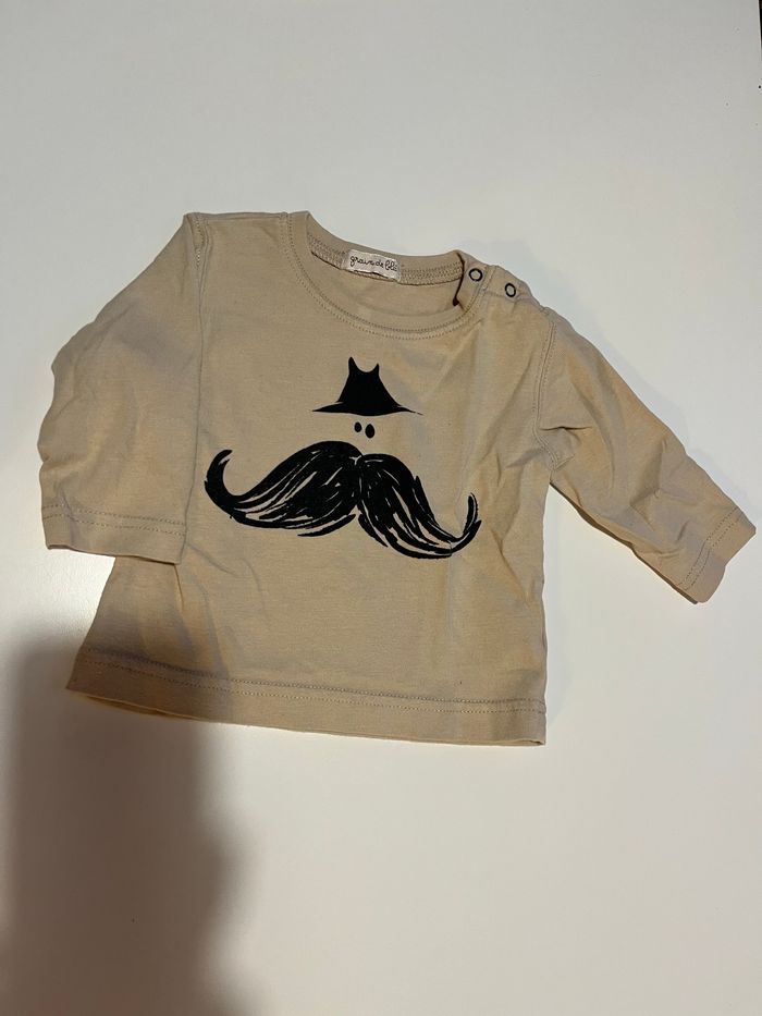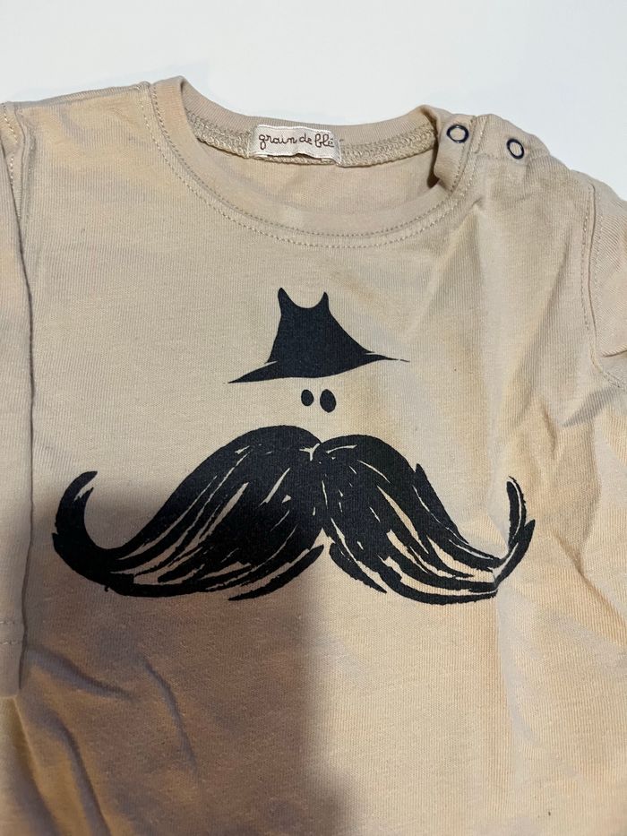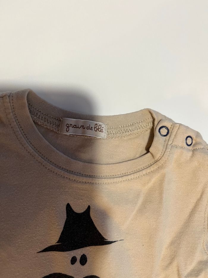haut beige crème à manche longue motif bonhomme à moustache avec chapeau marque grain de blé (génération Z) taille 3 mois en très bon état deux boutons sur l’épaule pour un enfilage facile