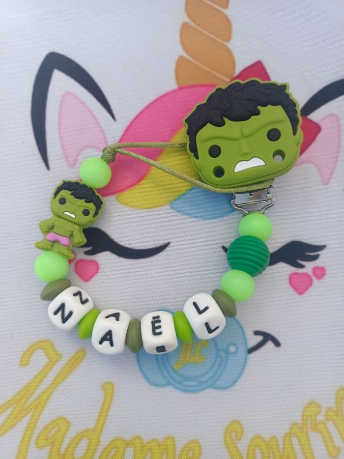 Une Attache tétine Hulk pour ne plus perdre la tétine avec une boucle pour attacher celle-ci (adaptateur MAM disponible pour les tétines MAM dans les accessoires) et un clip pour accrocher l'attache à un tissu sans l'abîmer. Respect des normes CE, composée de perles silicone alimentaire et/ou bois naturel. 100% personnalisable, énormément de choix de clips, perles, etc… Envoyez-moi un message afin de créer main dans la main votre accessoire idéal. Une photo du prototype de celui-ci vous est envoyé pour validation avant envoi.