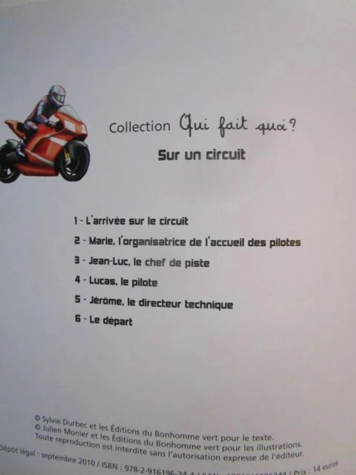 Léo et Flora, en visite sur un circuit de course, rencontrent les professionnels qui interviennent avant et pendant les courses de motos et de voitures. L'accueil des pilotes, l'organisation des compétitions, l'entretien de la piste et l'encadrement des courses sont autant de responsabilités pour ces professionnels amoureux des sports mécaniques. Éditeur ‏ : ‎ Les éditions du Bonhomme vert 48 pages Âge de lecture ‏ : ‎ 3 - 7 ans Dimensions ‏ : ‎ 22 x 1 x 22 cm Livre en parfait état #course #circuit #automobile #voituredecourse